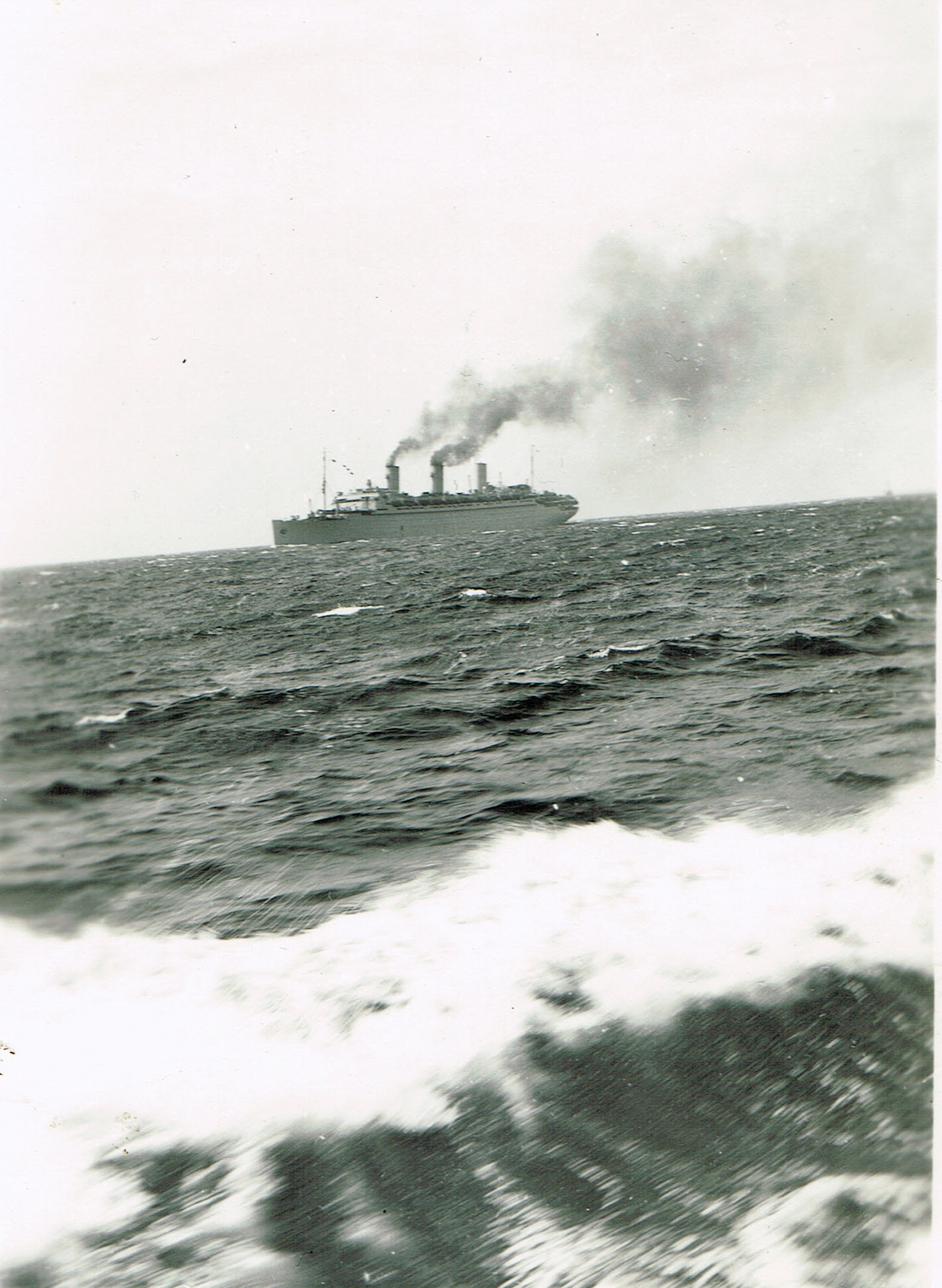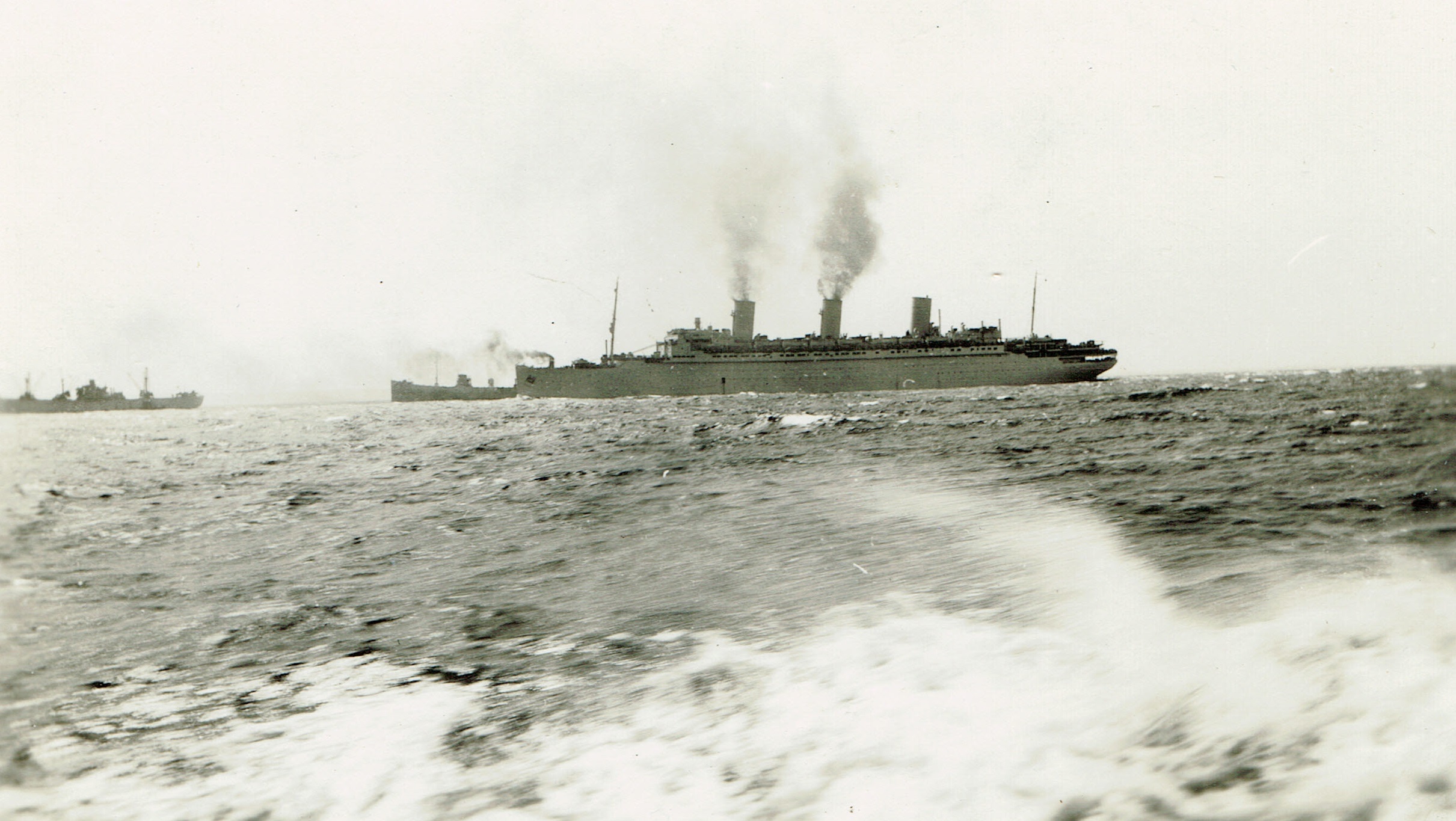 (PJ42-PJ43) Troopship Ile De France in convoy (PJ44) Merchant Aircraft Carrier (MAC) (PJ45) Anti-aircraft balloon - possibly somewhere in England