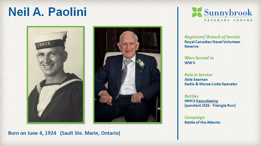PAOLINI, Neil Arthur - today, in the early morning of March 6, 2021, Neil A. Paolini, RCNVR, passed away at age 97 at Sunnybrook Veterans Centre, which he had entered last February 2020. Neil was proud of his WW II service in the 'wavy navy' and served the majority of his career on the Algerine class minesweeper; HMCS KAPUSKASING.