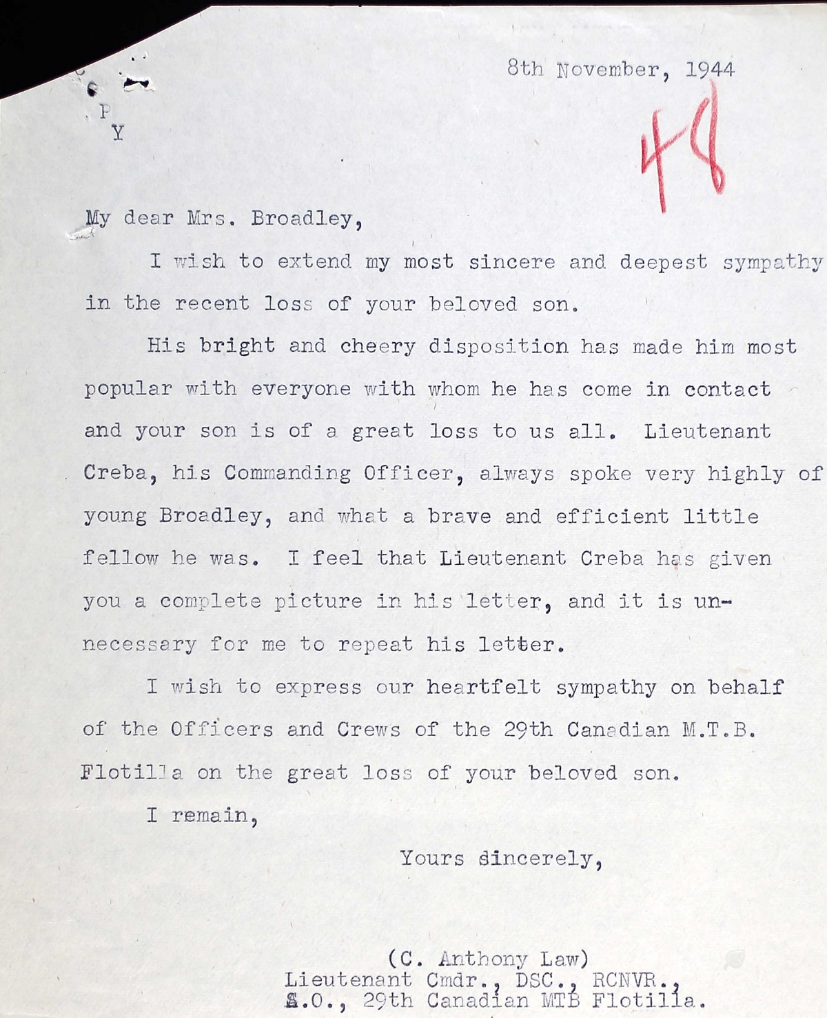 BROADLEY, Harry AB, V26160, RCNVR, killed - 01 Nov 1944, MTB-485 - Son of Hedley and Maria Broadley, St. Catharines, Ontario. Nephew of Mrs. R. Clark, Church, Accrington, Lancashire, England. Buried in Section B, Grave 178, St. James Churchyard Altham, Lancashire, England. AB Broadley was killed off the Dutch Coast when MTB 485 attacked an enemy convoy. The enemy action lasted several hours. AB Broadley died soon after he was wounded.