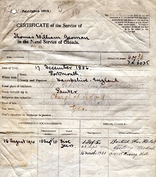 (AG01) Portrait of Bert German (AG02) Certificate of Service for Albert Thomas William (Bert) German (AG03) Ship's movements for HMCS RAINBOW for Jan 1916 - recorded by Bert German