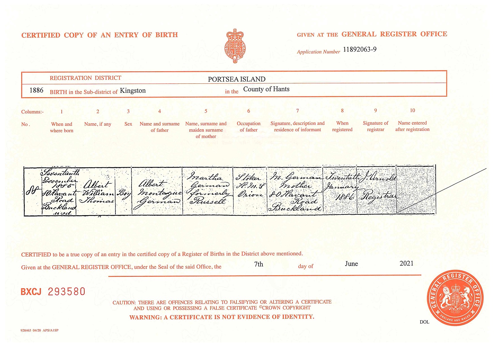 GERMAN, Albert Thomas William (Bert) was born on December 17, 1885, in Portsmouth. At age 23, he married Jane Elizabeth Breslin on February 21, 1909.