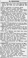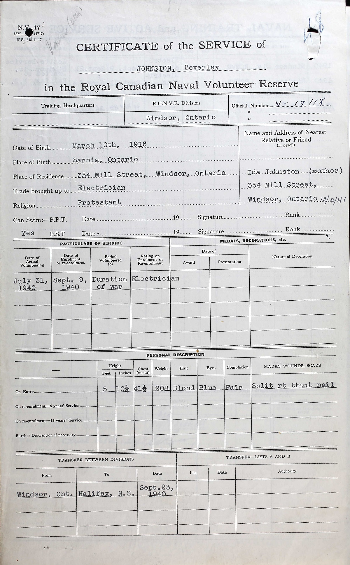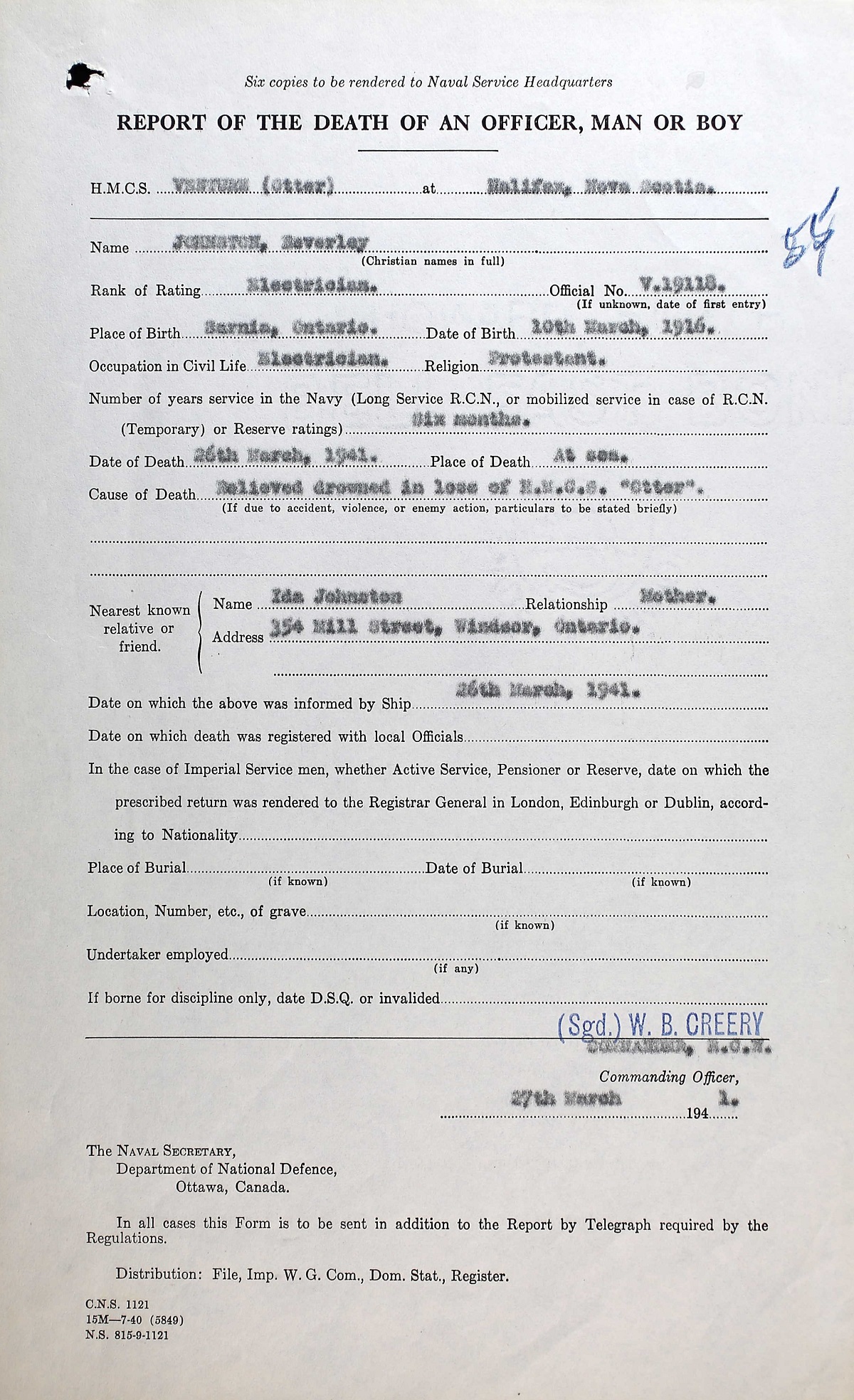 JOHNSTON, Beverley, Electrician, V19118, RCNVR, MPK - 26 Mar 1941, HMCS OTTER - Son of William and Ida Johnston, husband of Daisy Edith Johnston, all of Windsor, ON