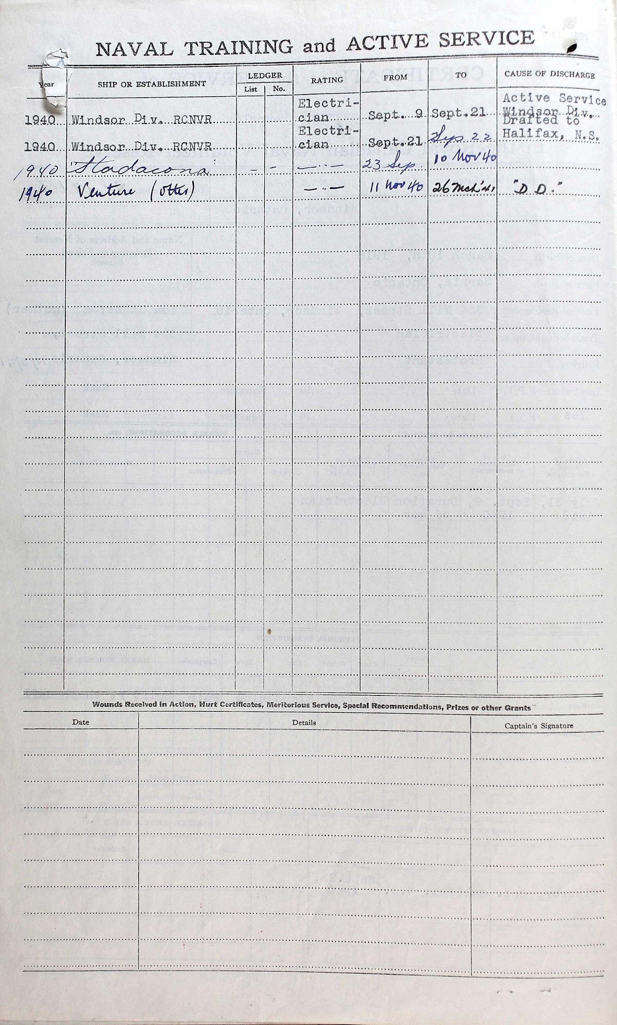 Ships served in: WINDSOR DIVISION RCNVR - Enlisted 09 Sep 1940. Commenced Active Service 21 Sep 1940 HMCS STADACONA - Drafted to STADACONA 23 Sep 1940 as an Electrician, RCNVR HMCS OTTER - Drafted to OTTER 11 Nov 1941 as an Electrician, RCNVR