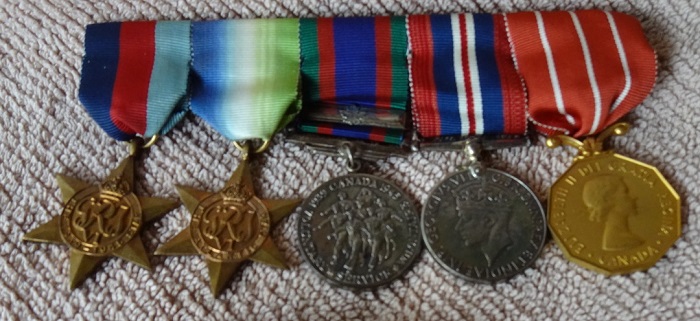 Awards and Decorations: 1939-1945 Star, Atlantic Star, Canadian Volunteer Service Medal with Clasp, The War Medal 1939-1945, Canadian Forces Decoration (CD).