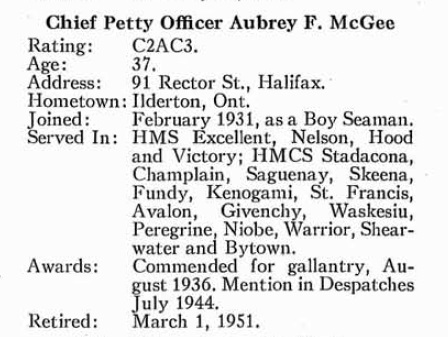 A/PO McGee joined the RCN in February 1931 as a Boy Seaman. On 25 July 1936, he was part of the Ship’s Company of HMCS SAGUENAY which marched to the unveiling of the Vimy Memorial on Hill 145, west of the village of Petit Vimy. He was Commended for Gallantry in August 1936. He served in Royal Navy Establishments HMS Excellent and HMS Victory; RN ships HMS NELSON, HMS HOOD; and RCN ships HMCS CHAMPLAIN, HMCS SAGUENAY, HMCS SKEENA, HMCS FUNDY, HMCS KENOGAMI, HMCS ST FRANCIS, HMCS WASKESIU, HMCS WARRIOR; and served in RCN establishments STADACONA, GIVENCHY (Esquimalt), NIOBE, SHEARWATER, PEREGRINE and BYTOWN. He retired on 01 March 1951 in Halifax at age 37.