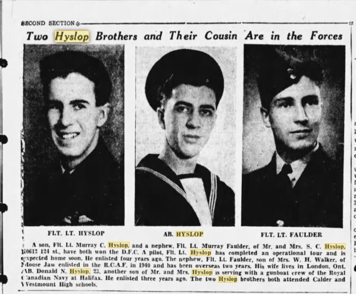 HYSLOP, Donald Neil (Don) - A resident of Green Valley since October 1984 and formerly of Tucson for 16 years, passed away September 9, 2005 at the age of 83. Born in Edmonton, Alberta on January 12, 1922, he started his career in banking in 1939. He joined the Canadian Navy and after a three and a half year stint as a radar operator on North Atlantic convoy duty he was discharged and resumed his banking career which covered a span of over 40 years. In 1962 the family moved to Los Angeles where he was employed by Crocker-Citizens Bank. In 1963 he took a position with Southern Arizona Bank, and through merger, with First National Bank of Arizona which became First Interstate. He retired in 1987. Don is survived by his loving wife of 52 years, Ethel; sons, David of Edmonton and Ken of Tucson; daughter, Karen of La Veta, Colorado; brothers, Murray of Surrey, British Colombia and Richard (Grace) of Edmonton and three grandchildren. In lieu of flowers, remembrances may be made to the charity of your choice. At Don's request there will be no services. To plant trees in memory, please visit our Sympathy Store. (Arizona Daily Star 16 Sep 2005)