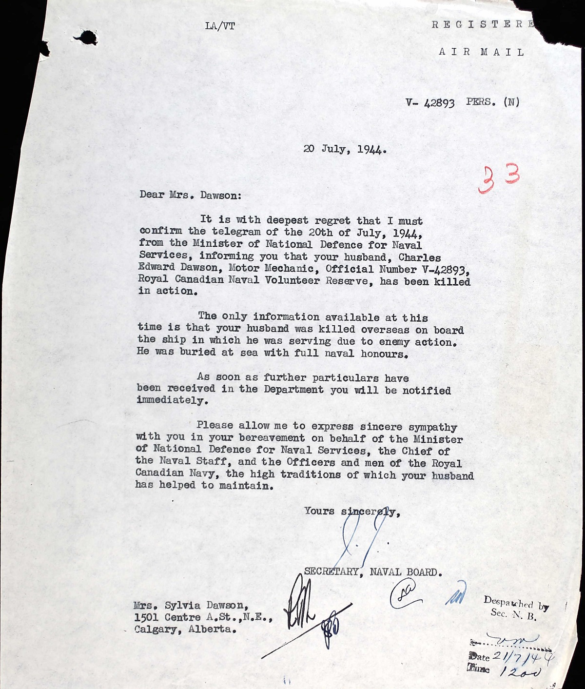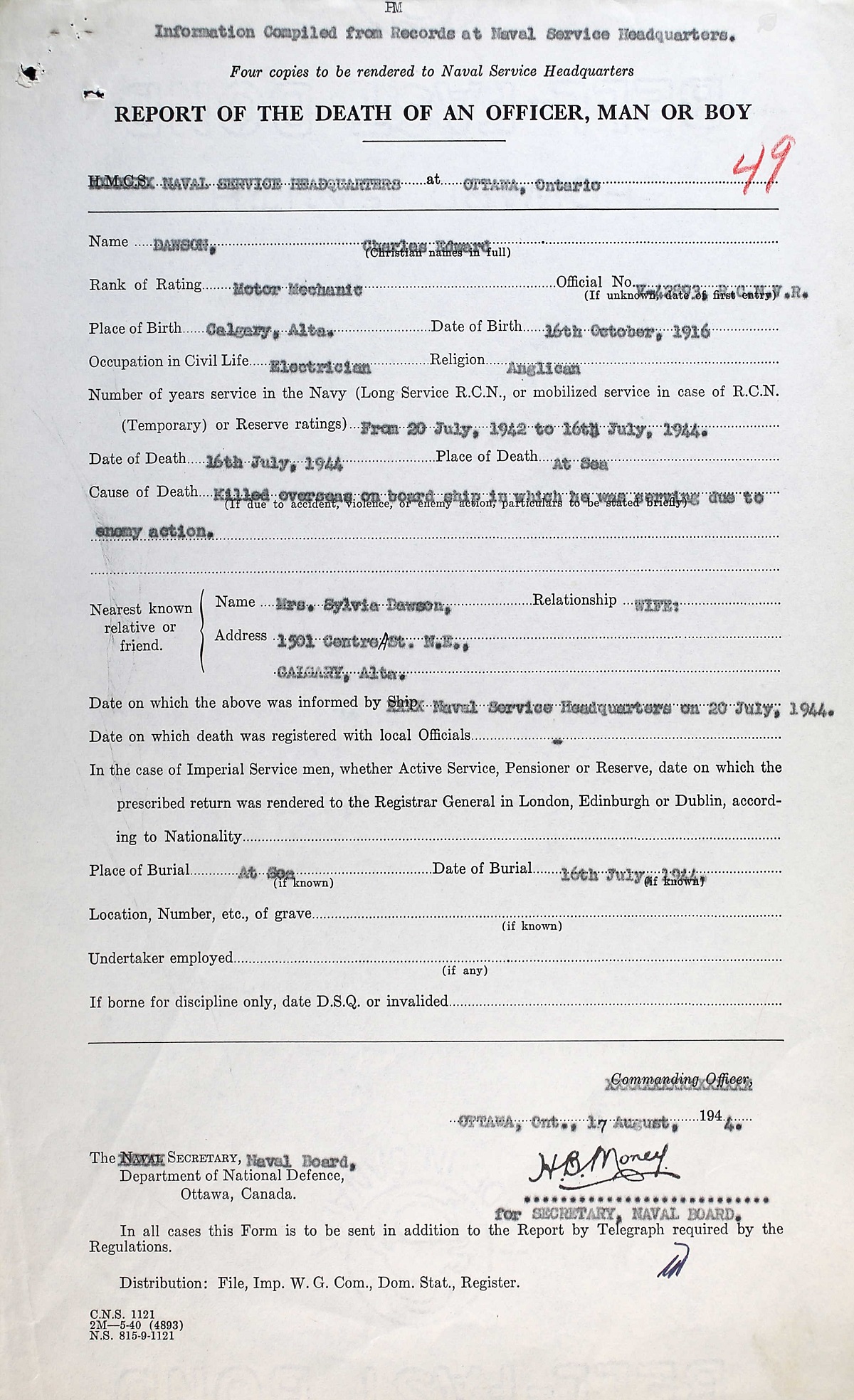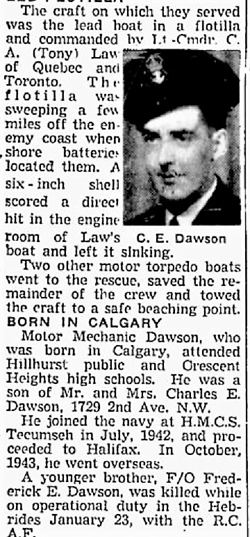 DAWSON, Charles Edward, PO.MM, V42893, RCNVR, Killed - 16 Jul 1944, MTB 459 - Son of Charles Edward and Alice Dawson; husband of Sylvia Frances Dawson, all of Calgary, AB