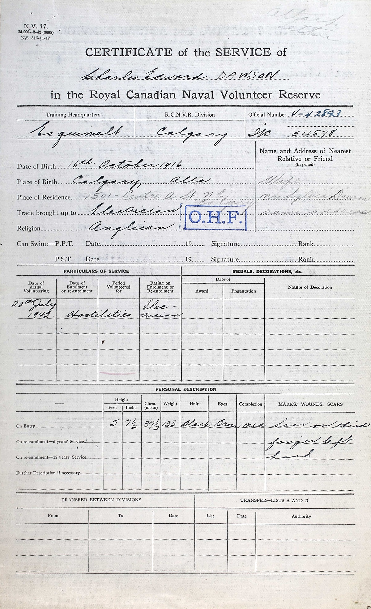 Ships served in: HMCS TECUMSEH - Enlisted 20 Jul 1942. Commenced Active Service 25 Jul 1942. HMS ATTACK (Royal Navy Coastal Forces Base, Portland, England) - Served in ATTACK 25 Oct 1942 - 22 Nov 1942 as a MM, RCNVR MGB10 - Served in MGB10 23 Nov 1942 - 05 Dec 1942 as a MM, RCNVR HMS ATTACK - Served in ATTACK 06 Dec 1943 - 07 Dec 1943 as a MM, RCNVR MTB 459 - Drafted to MTB 459 08 Dec 1943 as a MM, RCNVR