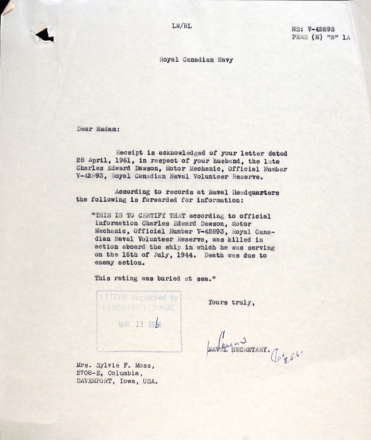PO.MM Charles E. Dawson was killed during action with the enemy. He was buried at sea.