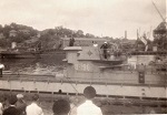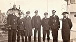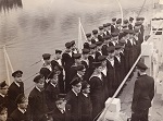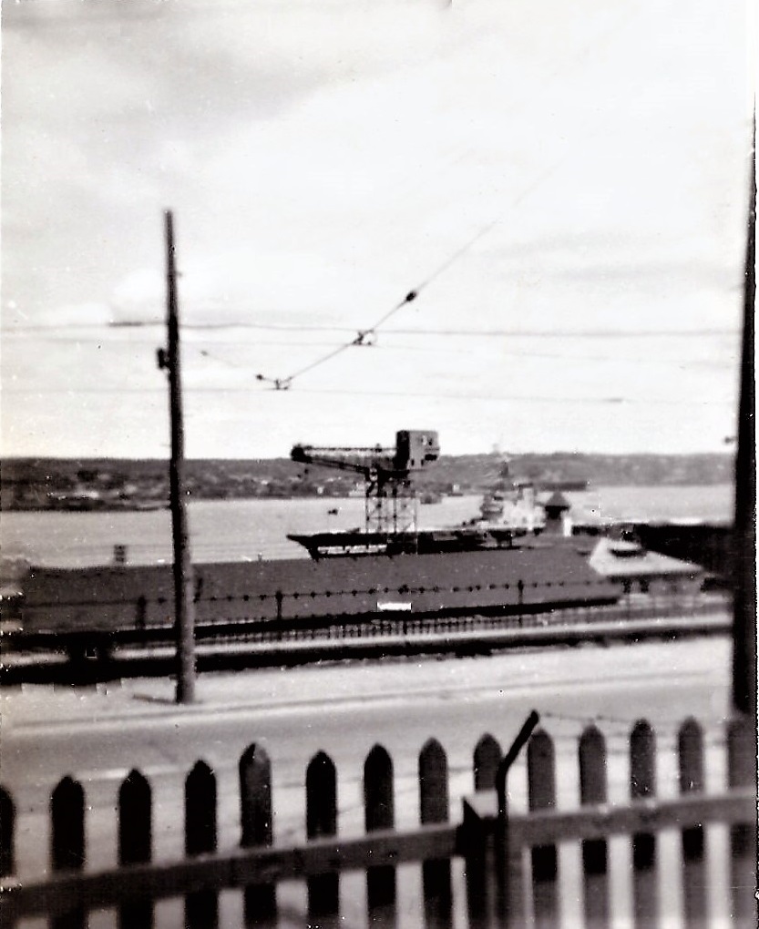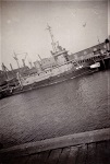 (DM21) Looking forward on unknown ship (DM22) Unknown aircraft carrier alongside in Halifax (DM23) Unknown tug moving barge with bi-planes (DM24-DM25) Crew mustered on quarterdeck of unknown frigate