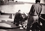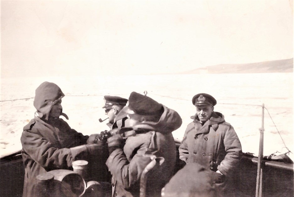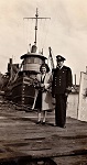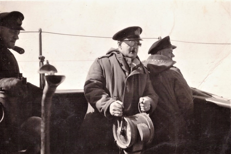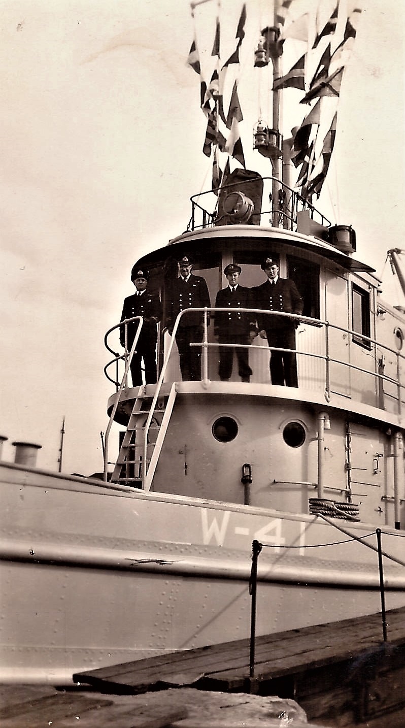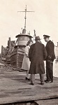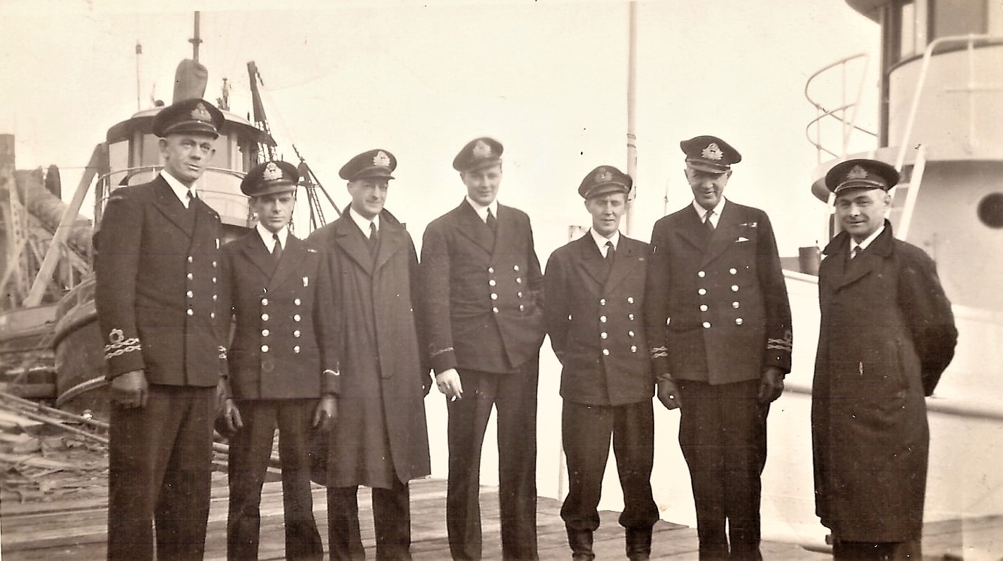 (DM02) Officers on the jetty with tug in background. Officer 2nd from right appears to be the CO of HMCS GLENELLA (DM02-DM03) CO of GLENELLA with unknown man and woman (DM05) Officers forward of the bridge of HMCS GLENELLA. CO 2nd from left (DM06) HMCS GLENELLA underway