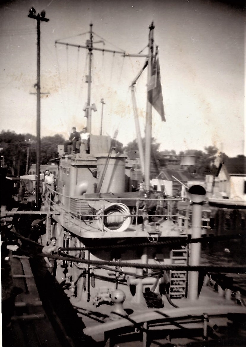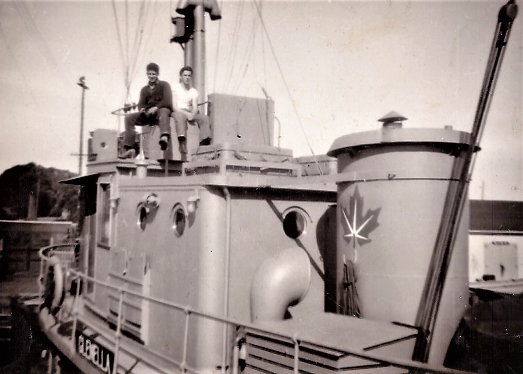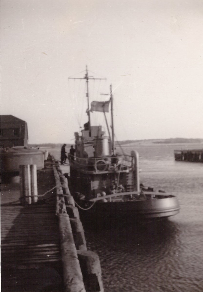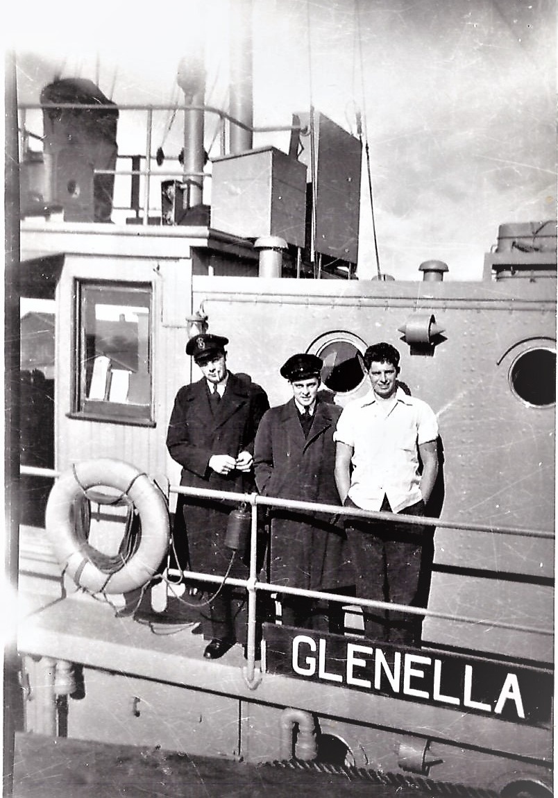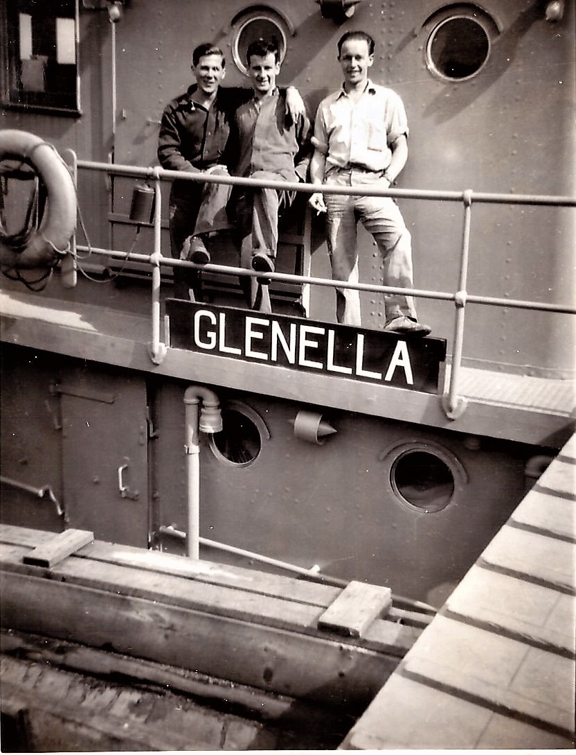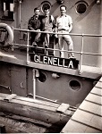 (DM12-DM13) Unknown sailors aboard HMCS GLENELLA (DM14) Doug Moore with shipmates on HMCS GLENELLA (DM15) Unknown sailors setting up what appears to be a phonograph aboard HMCS GLENELLA (DM16) HMCS GLENELLA towing a salvage barge