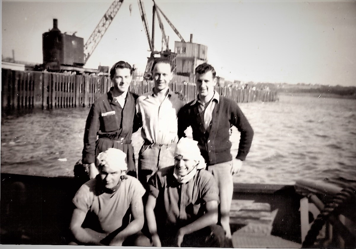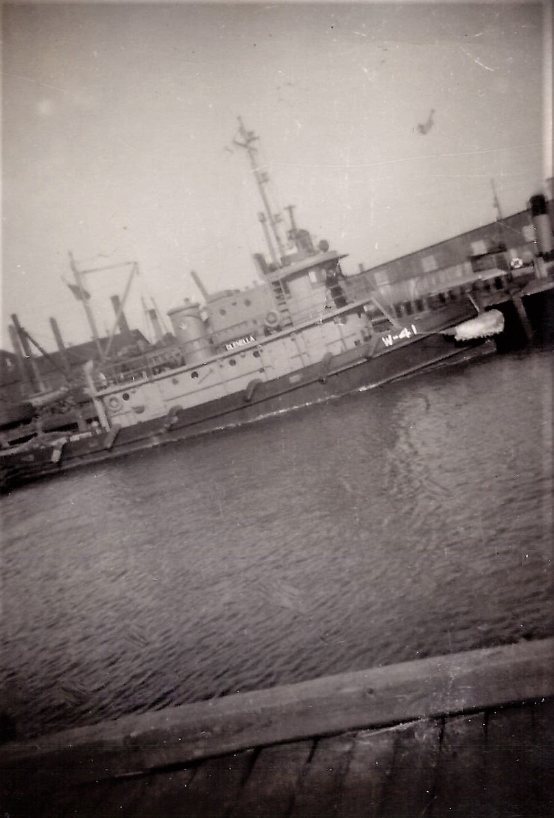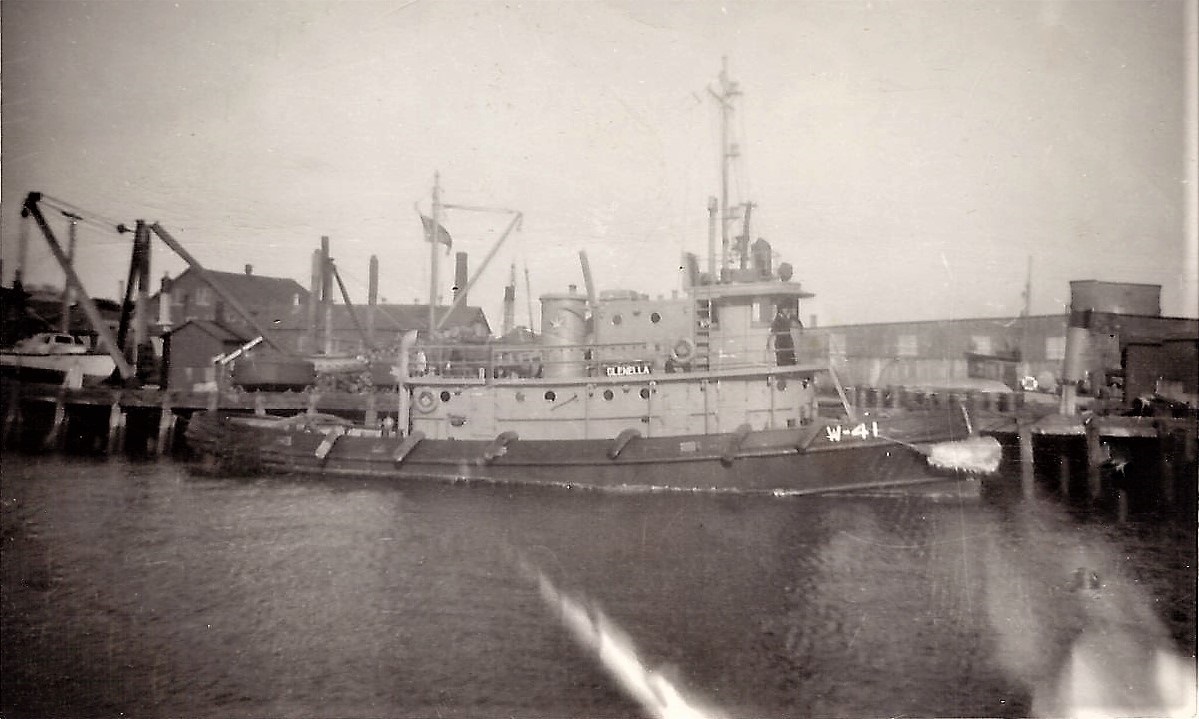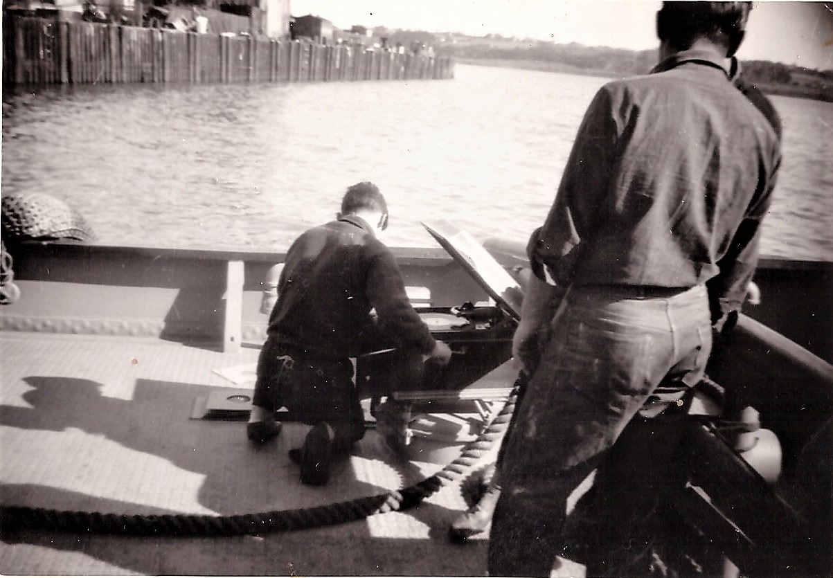 (DM12-DM13) Unknown sailors aboard HMCS GLENELLA (DM14) Doug Moore with shipmates on HMCS GLENELLA (DM15) Unknown sailors setting up what appears to be a phonograph aboard HMCS GLENELLA (DM16) HMCS GLENELLA towing a salvage barge