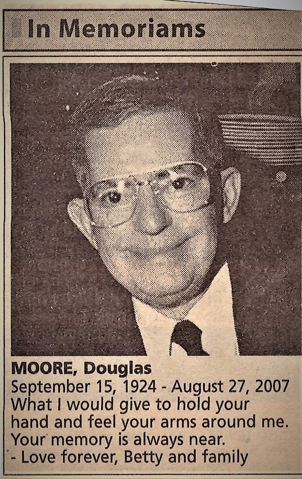 MOORE, Douglas Charles (Doug) - Peacefully on Monday, August 27, 2007 at the Wellington Long Term Care, in his 83rd year. Beloved husband of Betty for 61 years, loving father of Peter (Helene), Paul (Debbie), Patrick (Shelley), Michael (Kate) and Chris (Sharon). Proud grandpa of Kristine, Brian, Martin, Jeffery, Graham, Kimberley, Andrea, Gregory, Amy, Derek, Riann, Andy, Stephen, Amy, Jason, Nichole. Great-grandpa of Ethan, Isaac, Tristan, Carson and Jacob. Dear brother or Lorraine Newton, Madelon Burley, Ruth Cowl and Ron Moore. Cherished brother-in-law of Charlotte and Beverley. He will be dearly missed by daughter-in-law Brenda. Doug was a Naval Veteran of World War II. He was employed with Westinghouse Canada and a member of Masonic Lodge #594, Scottish Rite, Legion #163, SCOBA and the YMCA. Family will receive friends at Crestmount Funeral Home, 322 Fennell Avenue East on Thursday, August 30 from 2-4 and 7-9 p.m. Funeral service will be held on Friday, August 31, at 11 a.m. at Paramount Alliance Church, 1035 Paramount Drive. Cremation will follow. In lieu of flowers, donations to the Diabetes Society or the M.U.M.C. Children's Hospital would be greatly appreciated.