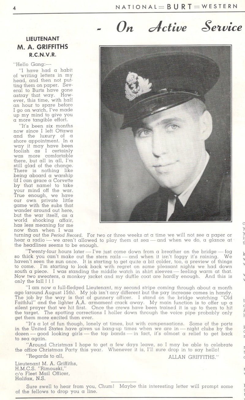 Ships served in: TORONTO DIVISION RCNVR - Listed as a Prob. SLt, RCNVR (Navy List Aug 1941) HMCS ROYAL ROADS - Appointed to ROYAL ROADS 02 Sep 1941 as a Prob. SLt, RCNVR (Navy List Oct 1941) NSHQ OTTAWA - Appointed to NSHQ, Operations Division 02 Jan 1942 as a SLt, RCNVR (Navy List Jan 1942) HMCS RIMOUSKI - Appointed to RIMOUSKI 06 Jun 1942 as a Lt, RCNVR (seniority 18 Aug 1942) (Navy List Sep 1942) HMCS KENOGAMI - Appointed to KENOGAMI 26 Jul 1943 as a Lt, RCNVR (Navy List Aug 1943). Appointed Lt (n), RCNVR (Navy List Oct 1943). Seniority backdated to 18 Aug 1941 (Navy List Jun 1944) HMCS STADACONA - Appointed to STADACONA, Add'l, For Disposal of Under Training, Command Course 22 May 1944 as a Lt (n), RCNVR (Navy List Jul 1944) HMCS OAKVILLE - Appointed to OAKVILLE 23 Oct 1944 as a Lt (n), RCNVR, CO (Navy List Nov 1944) * Retired List as a Lt, RCN(R) (seniority 18 Aug 1941) (Navy List Apr 1946). Appointed LCdr (n), RCN(R) (on the retired list) (seniority 18 Aug 1949) (Navy List Jul 1950) HMCS YORK (Retired List) - as a LCdr, RCN(R) (Navy List Jul 1952). Last noted on the Retired List at HMCS YORK as a LCdr, RCN(R) (Navy List Jan 1960)