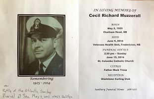 Cecil Muzzerall served in the RCNVR during the Second World War. In 1947 he join the RCN and served until 1968. H's ashes were committed to the sea in a ceremony aboard HMCS HALIFAX 330 on Battle of the Atlantic Sunday, 03 May 2015.