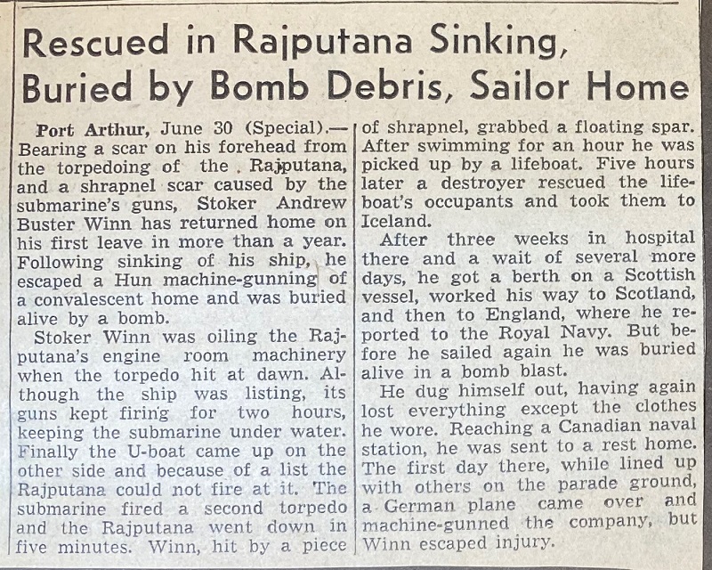 Stoker Andrew Buster Winn returns home on leave after surviving the sinking of HMS RAJPUTANA