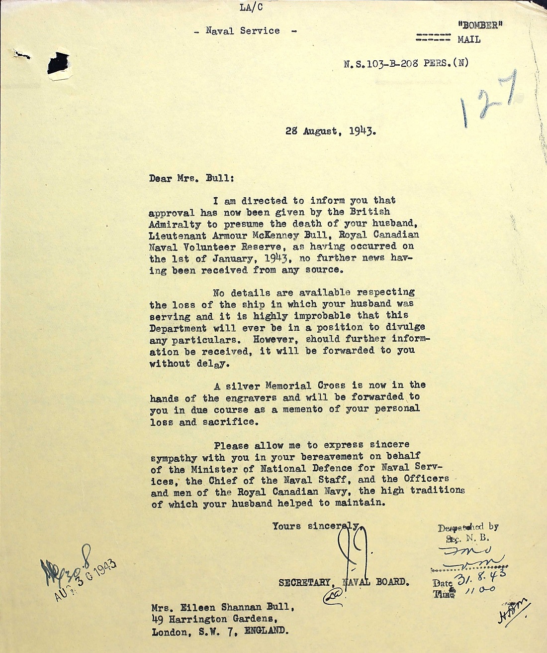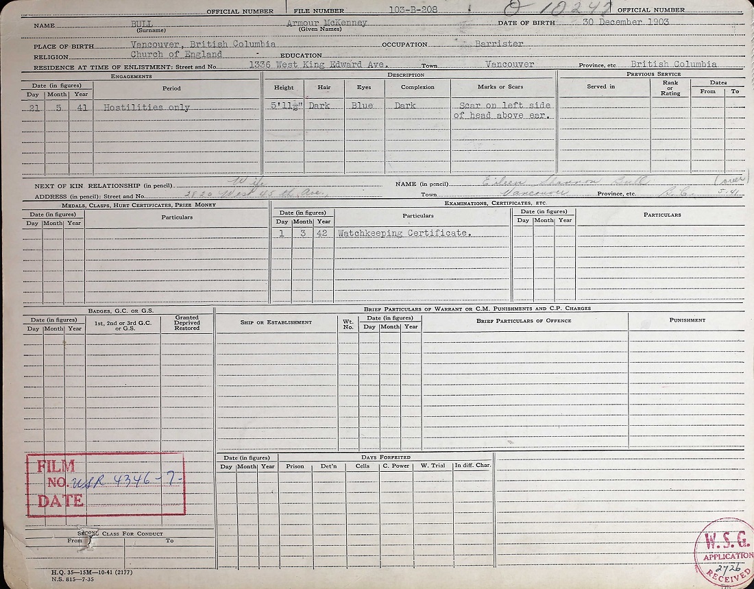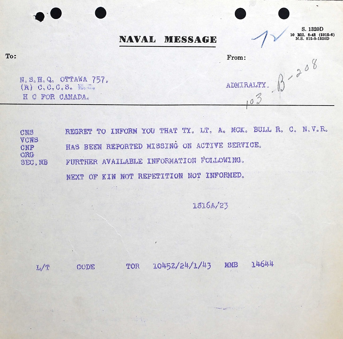 (AB01-AB02) Service Sumamry for Lt Armour Bull (AB03) Telegram to NSHQ Ottawa informing them Lt Bull is missing on active service (AB04) Letter to Armour Bull's wife informing her that he is presumed deceased (AB05) Newspaper article stating the Lt Armour Bull is missing - Vancouver Sun 18 Feb 1943