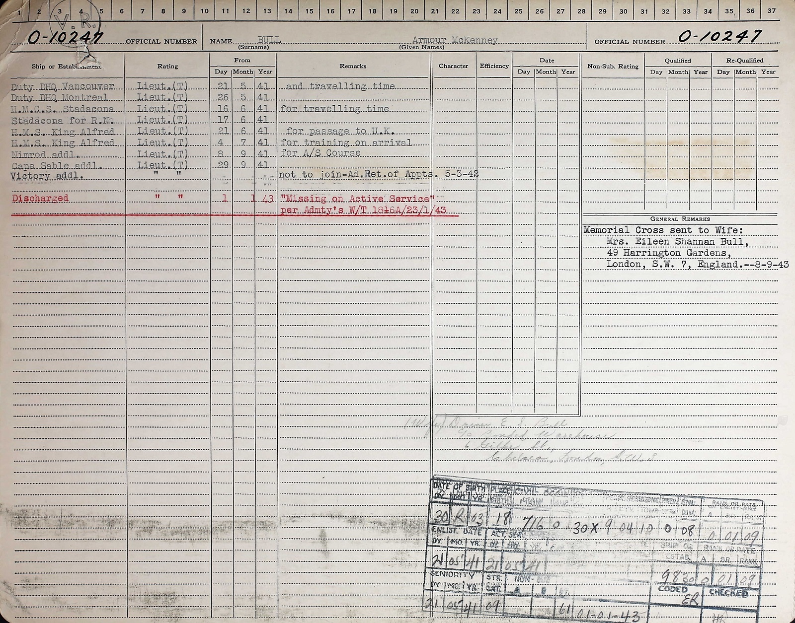 Ships served in: RCNVR DIVISION VANCOUVER - Appointed to RCNVR DIV VANCOUVER 21 May 1941 RCNVR DIVISION MONTREAL - Appointed to RCNVR DIV MONTREAL 26 May 1941 HMCS STADACONA - Appointed to STADACONA 16 Jun 1941 for travel time, appointment to RN for training HMS KING ALFRED - Appointed to KING ALFRED 21 Jun 1941 for passage to UK and training HMS NIMROD - Appointed to NIMROD 08 Sep 1941 for A/S Course HMS CAPE SABLE (Q-ship) - Appointed to CAPE SABLE 29 Sep 1941 HMS VICTORY - Appointed to VICTORY as add'l HMS FIDELITY (SSV) - Appointed to FIDELITY for passage.