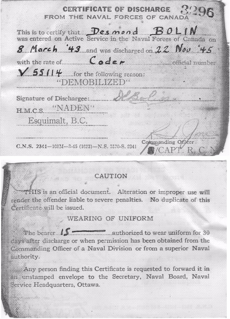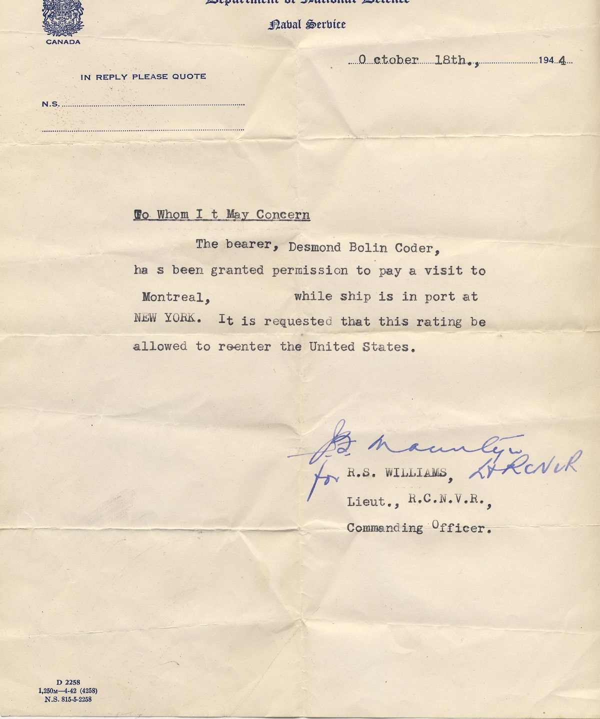 (DB01) Signalman Desmond Bolin (DB02) Letter dated 18 Oct 1944 requesting that Coder Desmond Bolin be given permission to re-enter the USA after visiting Montreal while his ship (SASKATOON) was in port at New York city (DB03) Certificate of Discharge for Coder Desmond Bolin