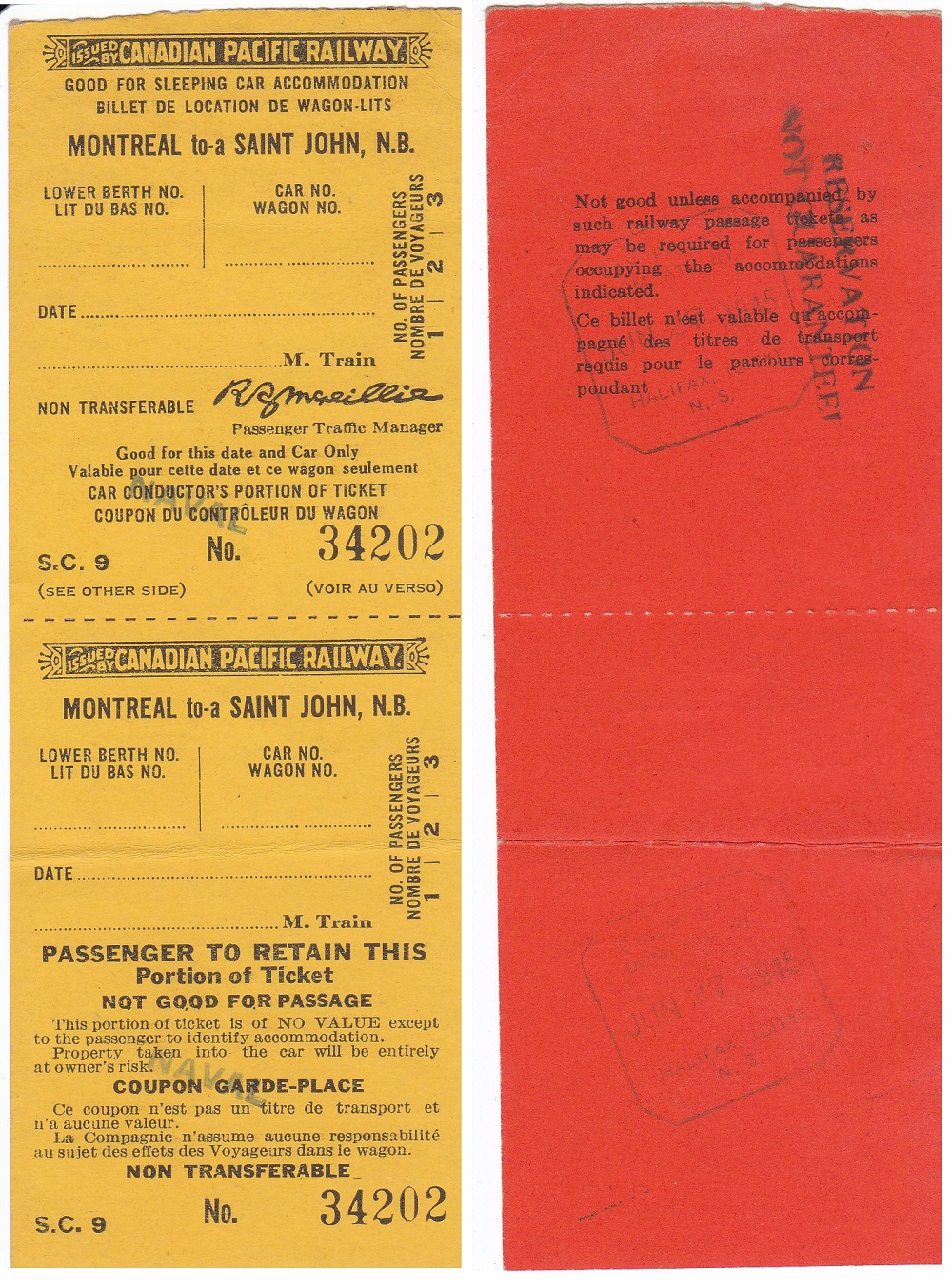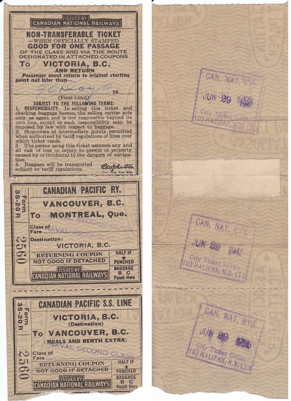 (DB04) Train ticket from Victoria, BC to Port Alberni, BC - stamped 07 Jun 1945 (DB05) Round trip train ticket from Montreal, QC to Victoria, BC - stamped 29 Jun 1945 (DB06) Train ticket from Montreal, QC to Saint John, NB - stamped 27 Jun 1945