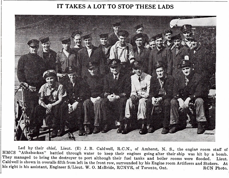 Engine room department of HMCS ATHABASKAN G07 in port after she was hit by a glide bomb.