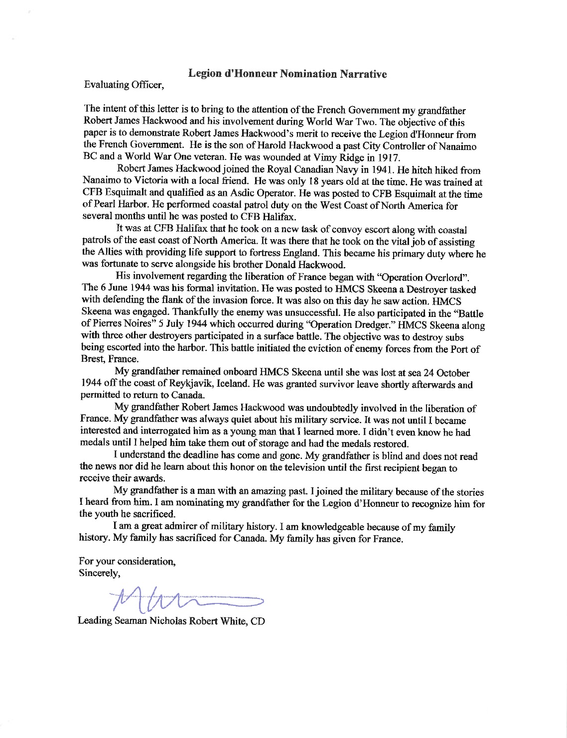 (RH01) Portrait of Seaman Robert Hackwood, age 18 (RH02) Letter written by LS Nicholas R. White (grandson of Robert Hackwood), nominating him for the French Legion d'Honneur (RH03) Notification of the award of the Legion d'Honneur to Robert Hackwood