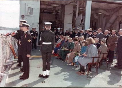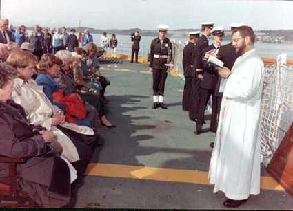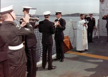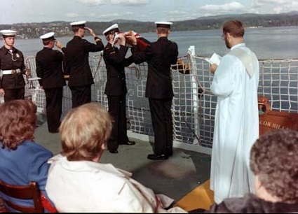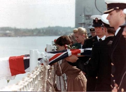 The ashes of Cdr Edward Theodore Simmons are committed to the sea during a service aboard HMCS HURON in 1989