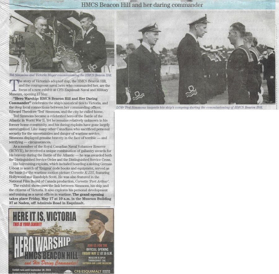 In 1944, Lieutenant-Commander E.T. Simmons DSO, DSC, returned to his hometown to commission the River class frigate HMCS BEACON HILL. "Victoria's very own ship" was soon engaged in patrol and convoy duties in the Irish Sea and English Channel with Ted Simmons - now an acting commander - as Senior Officer of Escort Group 26, an "all-Canadian striking force". By war's end, BEACON HILL had supported, or distantly supported, a total of 79 convoys under the command of her famous 'sub chaser' captain.