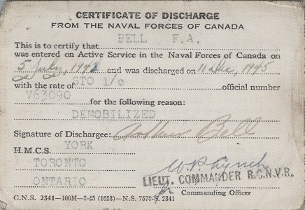 Ships served in: HMCS YORK - Enlisted 05 Jul 1942 HMCS YORK - Demobilized 11 Dec 1945