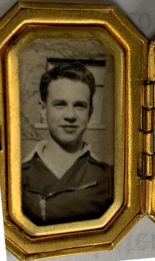 (HC01) Photo of Harvey Carlsen in a locket (HC02) Documents from the Service File of Harvey Carlsen (HC03) Article on Stoker Carlsen return to ship after being home on leave