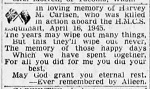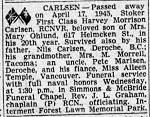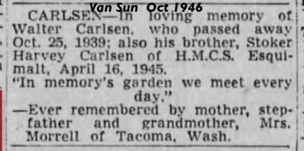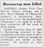 (HC04) Article on the death of Stoker Harvey Carlsen (HC05) Obituary for Stoker 1c Harvey Carlsen (HC06) Part of an article on HMCS ESQUIMALT casualties which lists Stoker Harvey Carlsen (HC07) In memory of Walter Carlsen and his brother Stoker Harvey Carlsen (HC08) In memory of Stoker Harvey Carlsen