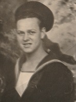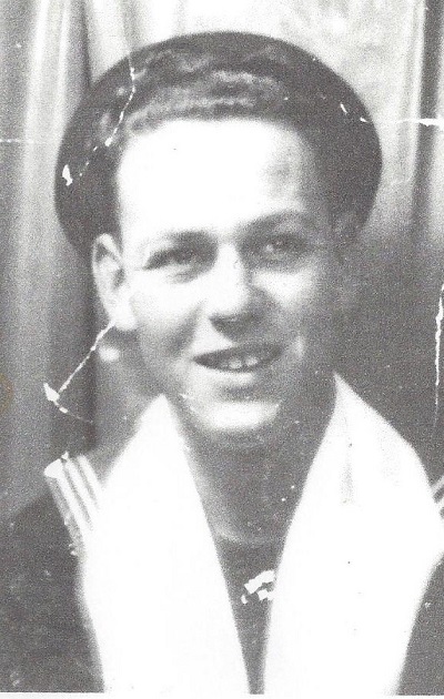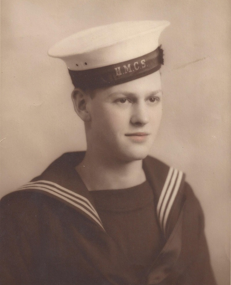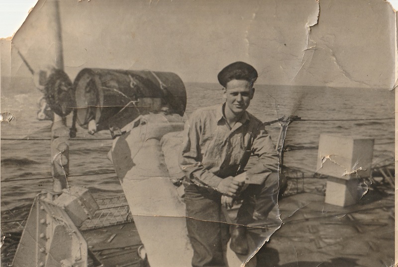 (CT04) Cecil Tardiff sitting on a Depth Charge Thrower on HMCS LOCH MORLICH