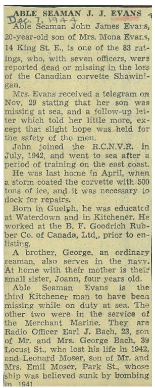 EVANS, John James, AB, V42620, RCNVR, MPK - 24 Nov 1944, HMCS SHAWINIGAN - Son of Stephen Evans, and of Mona Evans, of Kitchener, Ontario.