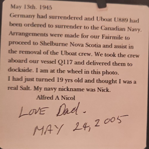 Ships served in: ML Q117 - Alfred Nicol was serving in Q117 when she took art in the surrender of U-889 off Shelburne, NS.