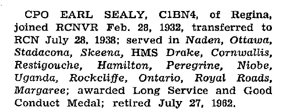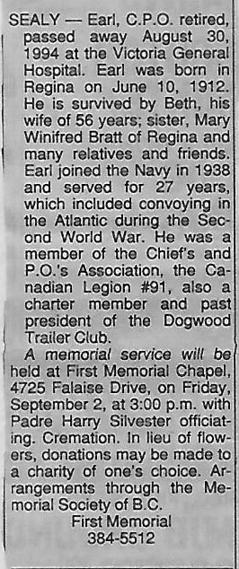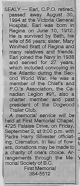 (ES08) Obituary for Earl Sealy (ES09 Headstone for CPO Earl Sealy in the Veterans Cemetery, Victoria, BC. (source: Find a Grave)
