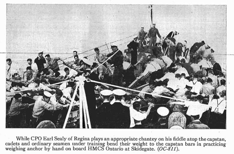 (ES06) CPO Earl Sealy plays his fiddle atop the ONTARIO'S capstan while Cadets and Ordinary Seaman under training practice weigh anchor by hand. Crowsnest Magazine Sep 1951
