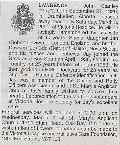 served in HMCS OTTAWA - it is not know if he served in Ottawa H60 or H31 HMS MEADOWSWEET HMCS SKEENA - Served in SKEENA as Cox'n