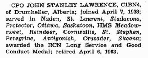 Retirement notice for CPO John Lawrence Crowsnest Magazine May 1963