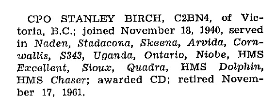 BIRCH, Stanley - was predeceased by his wife of over 60 years, Jackie and his son Kip. He was a loving father to Penny (Larry), George (Sue) and Darla (Brett); a proud grandfather to Michael, Ryan, Alicia, Michelle, Sheena (Dan), Evan and Tessa and a caring great-grandfather to Hunter. Stan was a working man, retiring as a Deputy Assessor for the BC Assessment Authority and a service man, retiring from the Royal Canadian Navy after a 22 year career including WWII and Korean War Peacekeeping. After many years of living independently, Stan passed away with family by his side in Victoria, BC. He will be sorely missed and remembered as a driven, dedicated and very generous man. A 'Celebration of Life' for friends and family to be arranged. (Victoria Times Colonist 03 Oct 2015)