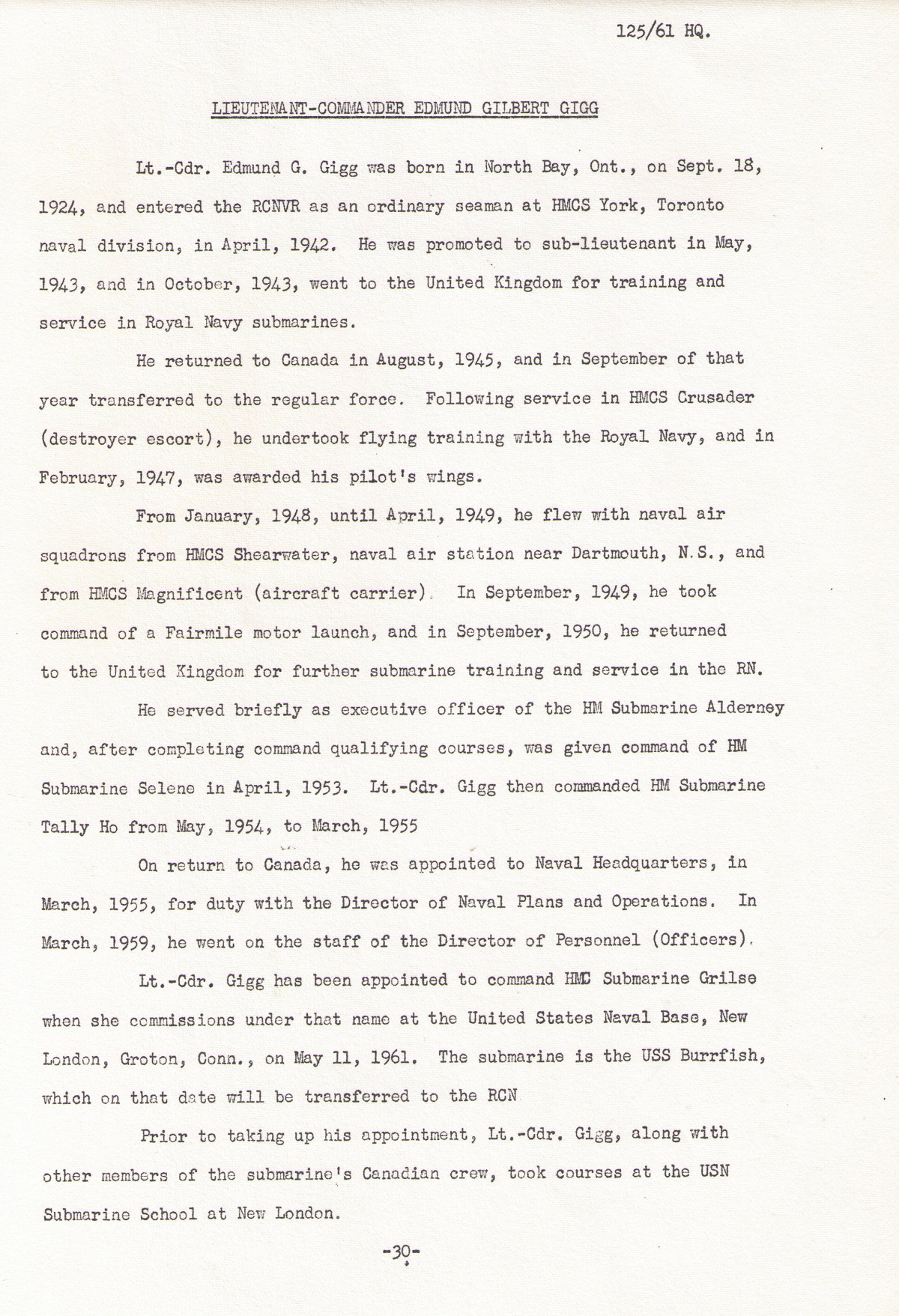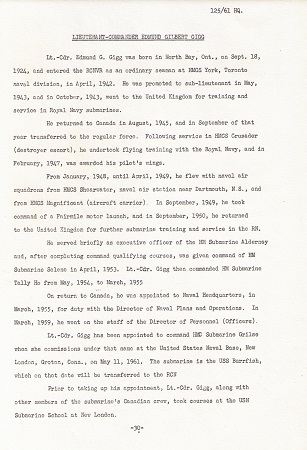 (left) Portrait of LCdr Edmund Gigg (right) Press release biography on LCdr Gigg on his assuming command of HMCS GRILSE