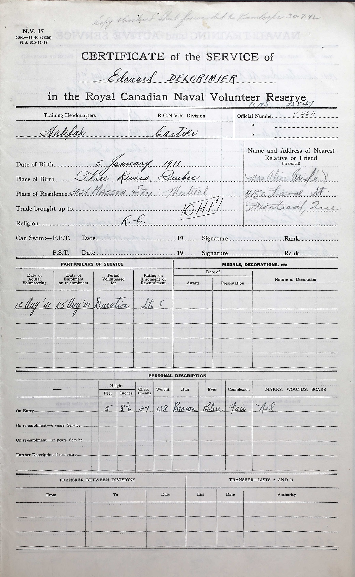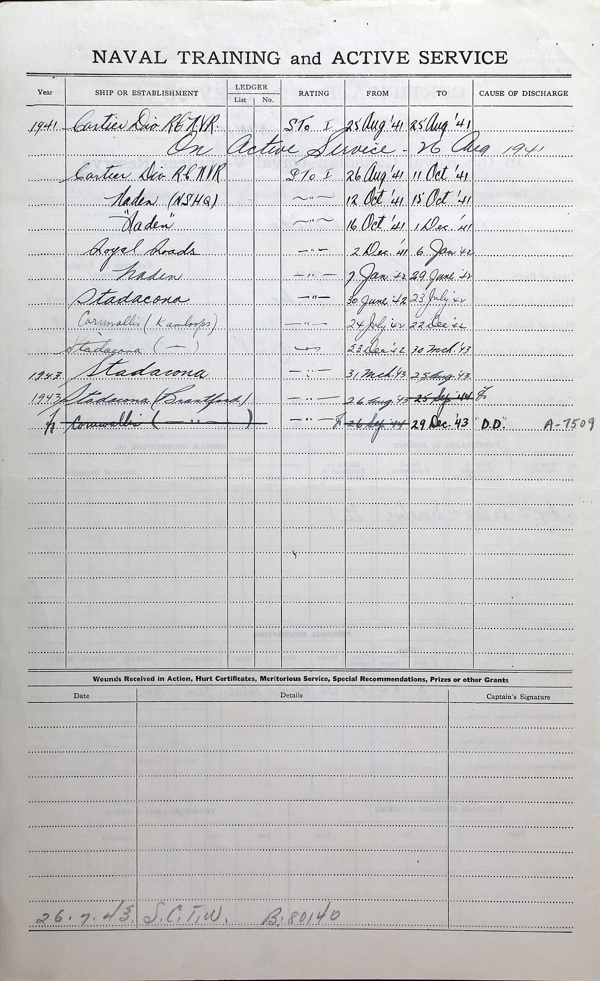 Ships served in: CARTIER DIVISION RCNVR - Enlisted 25 Aug 1941 HMCS KAMLOOPS - Served in KAMLOOPS 24 Jul 1942 - 30 Mar 1943 as a Sto 1c, RCNVR HMCS BRANTFORD - Drafted to BRANTFORD 26 Aug 1943 as a Sto 1c, RCNVR