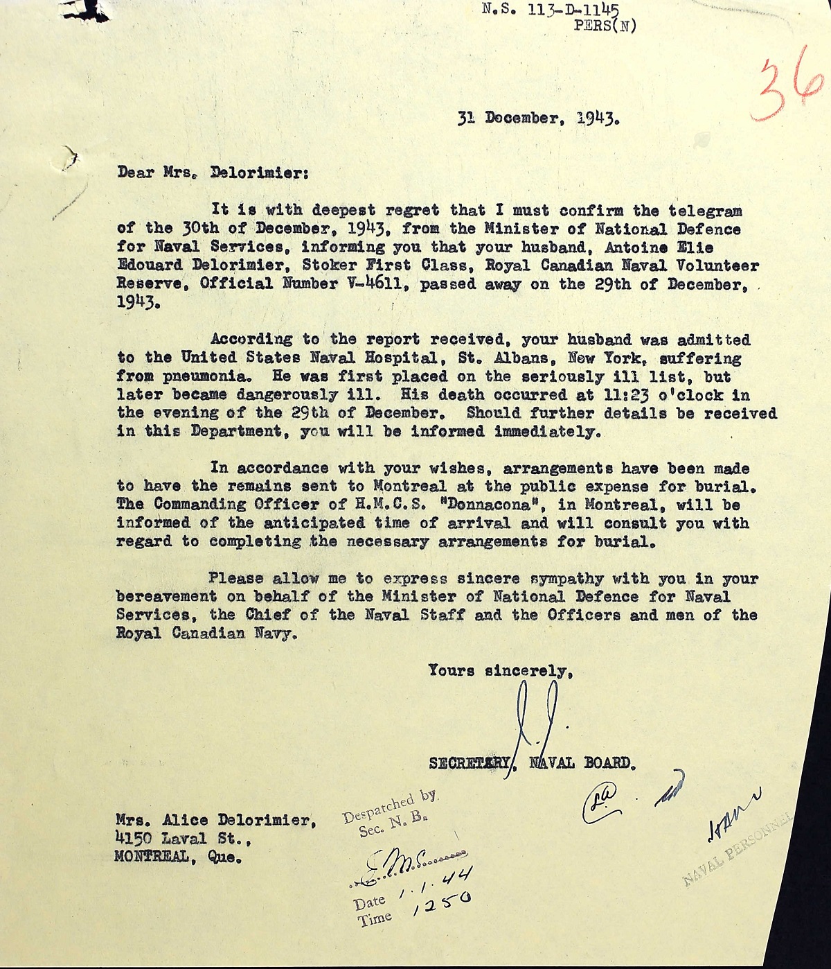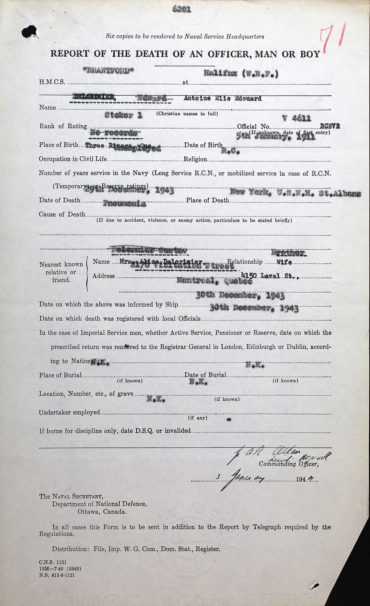 DE LORIMIER, Antoine Elie Edouard, Sto 1c, V4611, RCNVR - died 29 Dec 1942, HMCS BRANTFORD - Son of Gustave and Alice De Lorimier; spouse of Alice De Lorimier, Montréal, QC.