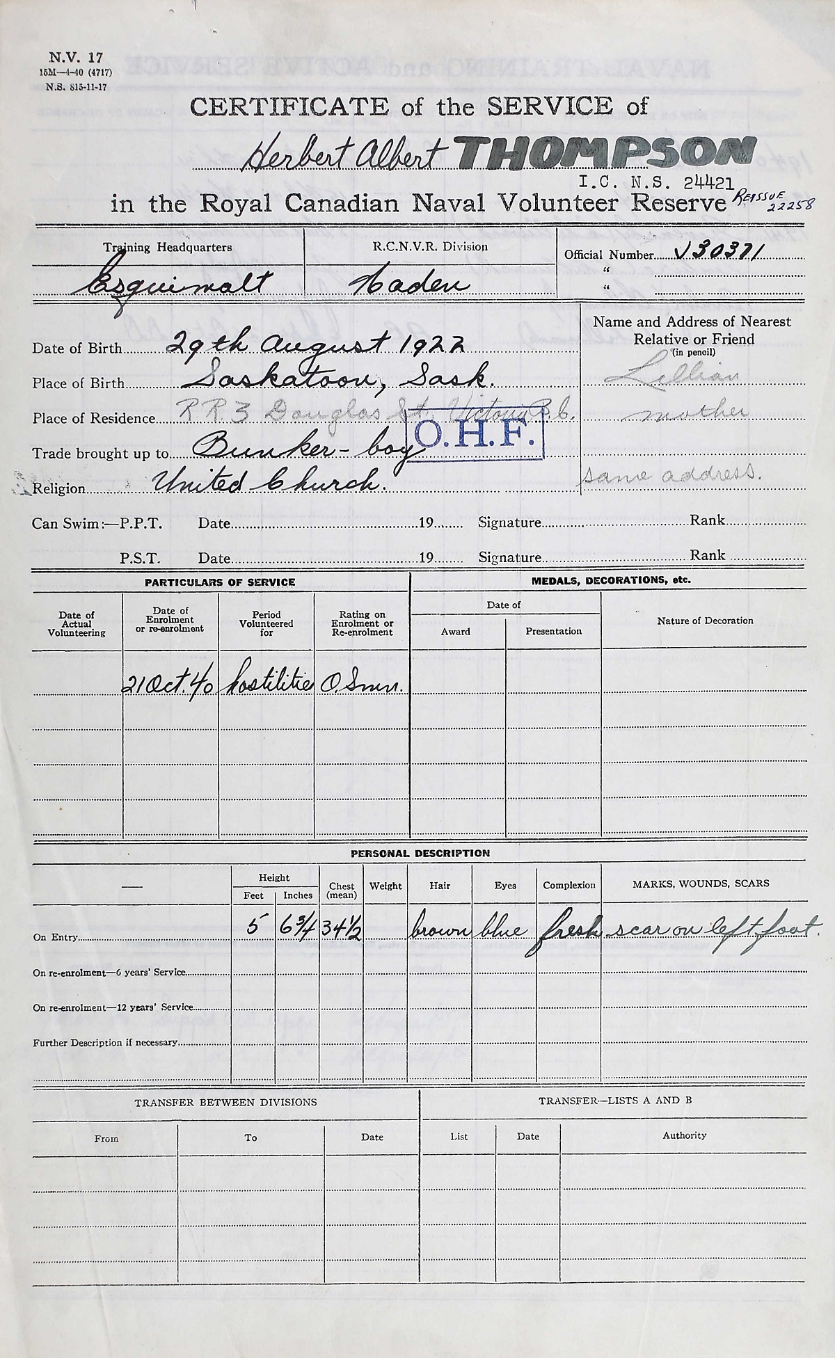 THOMPSON, Herbert Albert, AB, V30371, RCNVR, MPK - 26 Oct 1941, HMCS CHILLIWACK - Son of Mrs. Lillian Thompson, of Victoria, British Columbia.