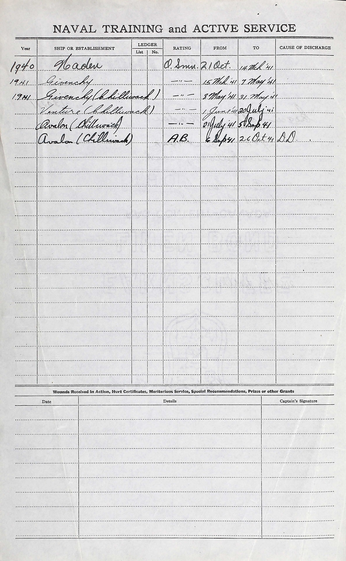 Ships served in: HMCS GIVENCHY - Served in GIVENCHY 15 Mar 1941 - 07 May 1941 as an OS, RCNVR HMCS CHILLIWACK - Drafted to CHILLIWACK 08 May 1941 as an OS, RCNVR. Rated AB 06 Sep 1941