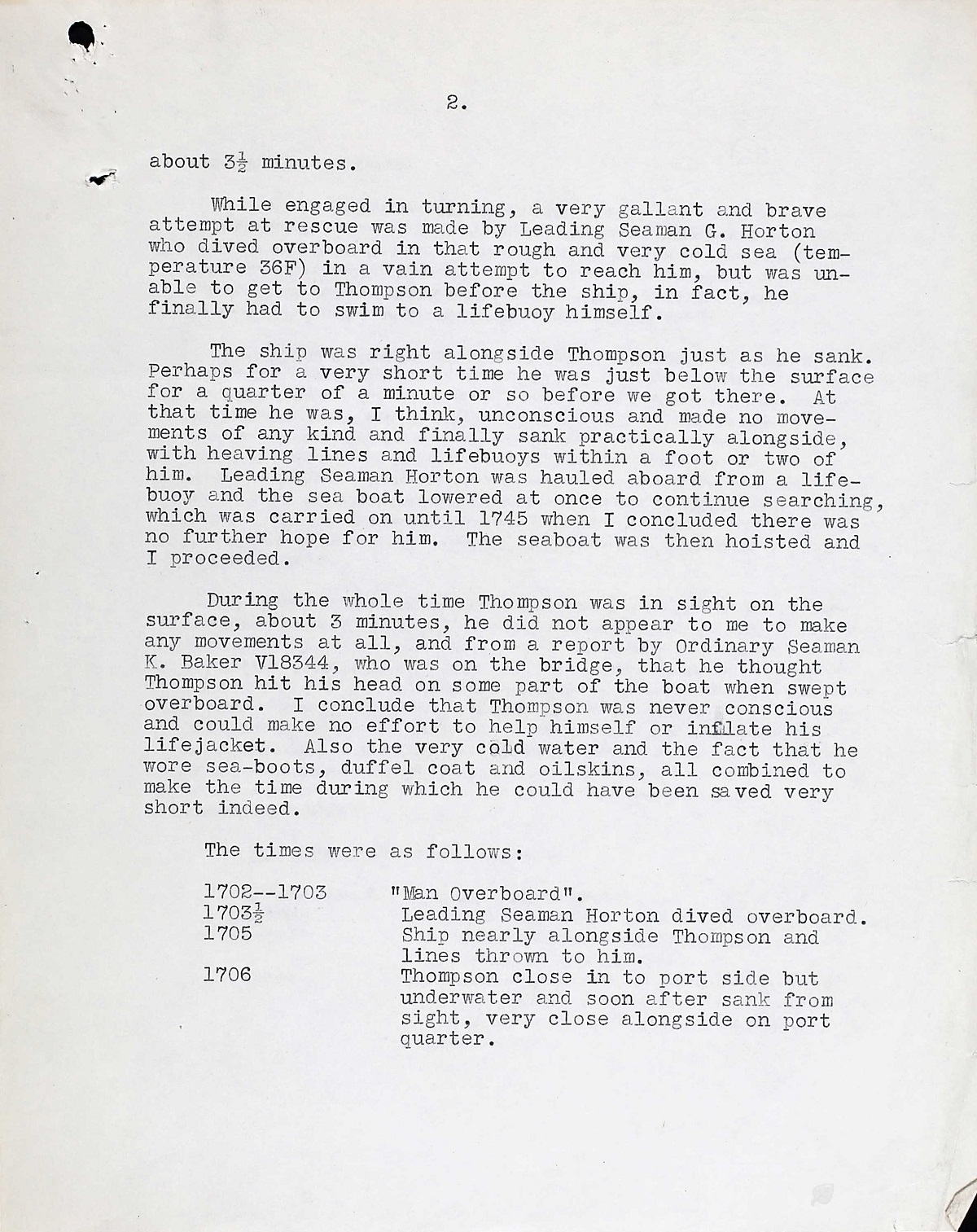 Able Seaman H. A. Thompson died when he was washed overboard in heavy seas - he lost both his grip and footing and was swept overboard between the edge of the deck and the ship's boat.