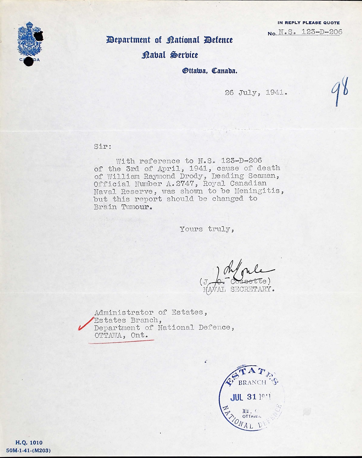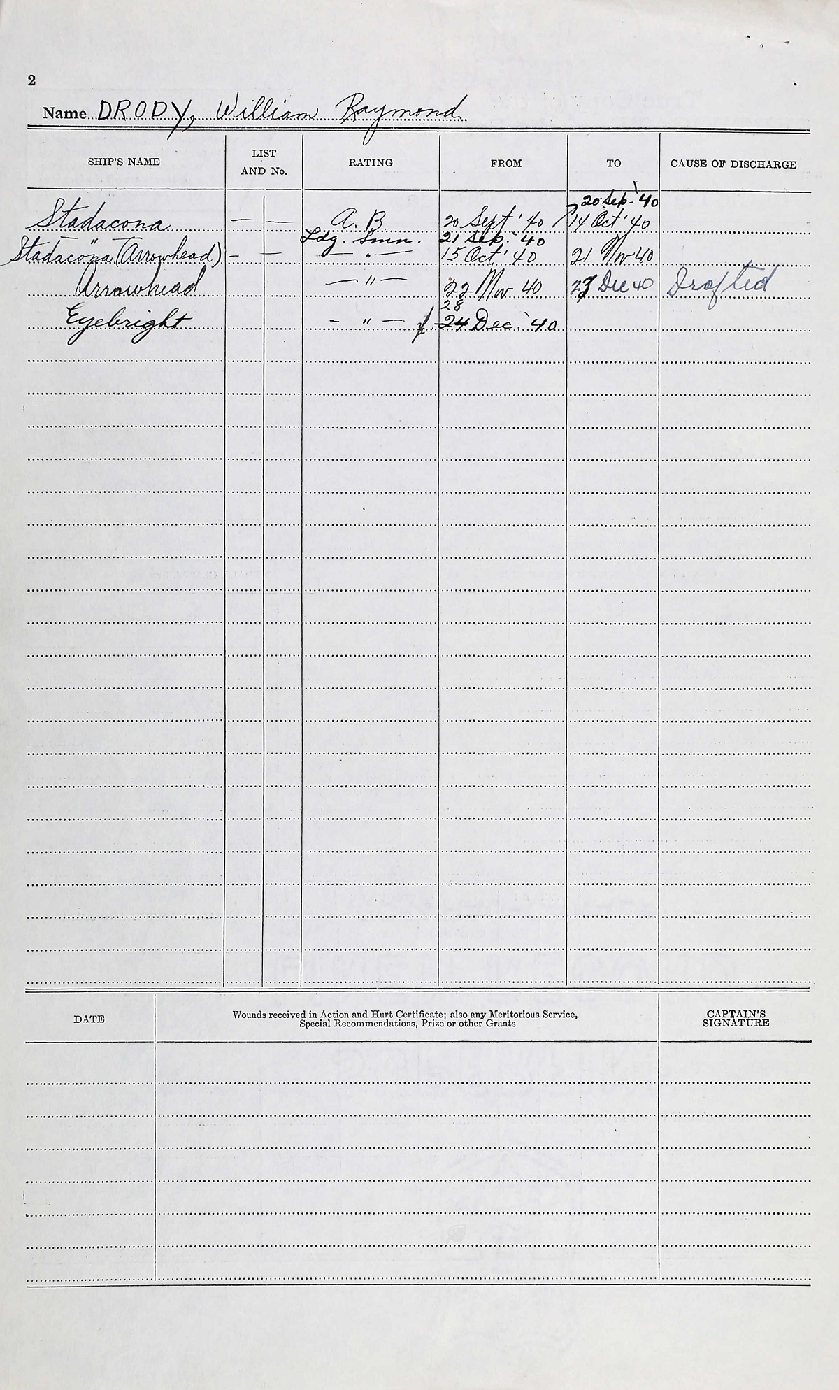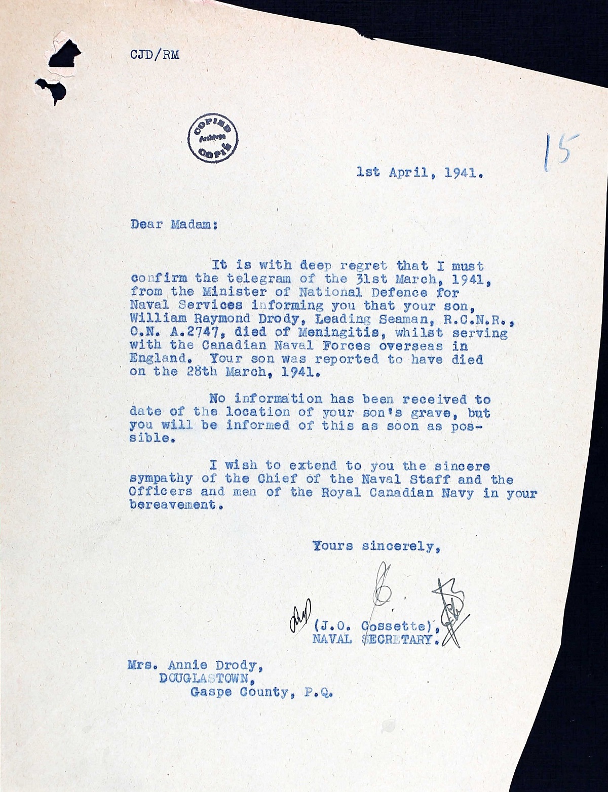 DRODY, William Raymond, LS, A/2747, RCNR, killed - 28 Mar 1941 - HMCS EYEBRIGHT - Son of William and Ann Drody of Douglastown, Gaspe, QC.
