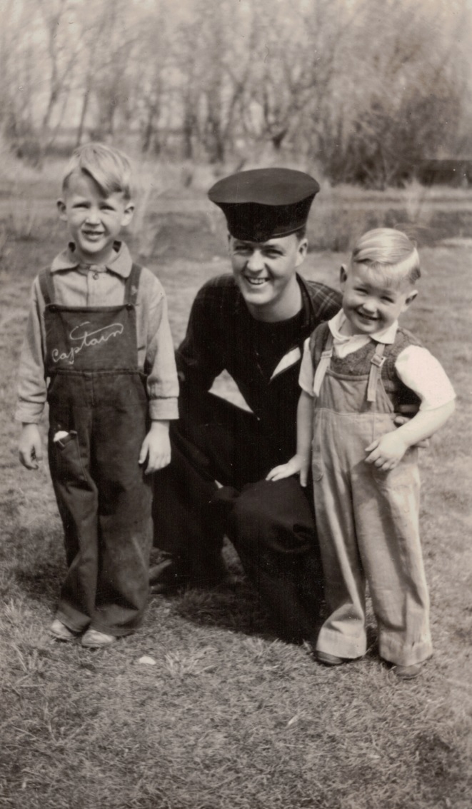 (GM05) Newspaper article photo: Local Watrous boys in Navy Enjoy Reunion in Halifax - Herb Penner, Roy Simle, Gordon McMaster, Bill Carlson, Lorne Dagert, George Mason