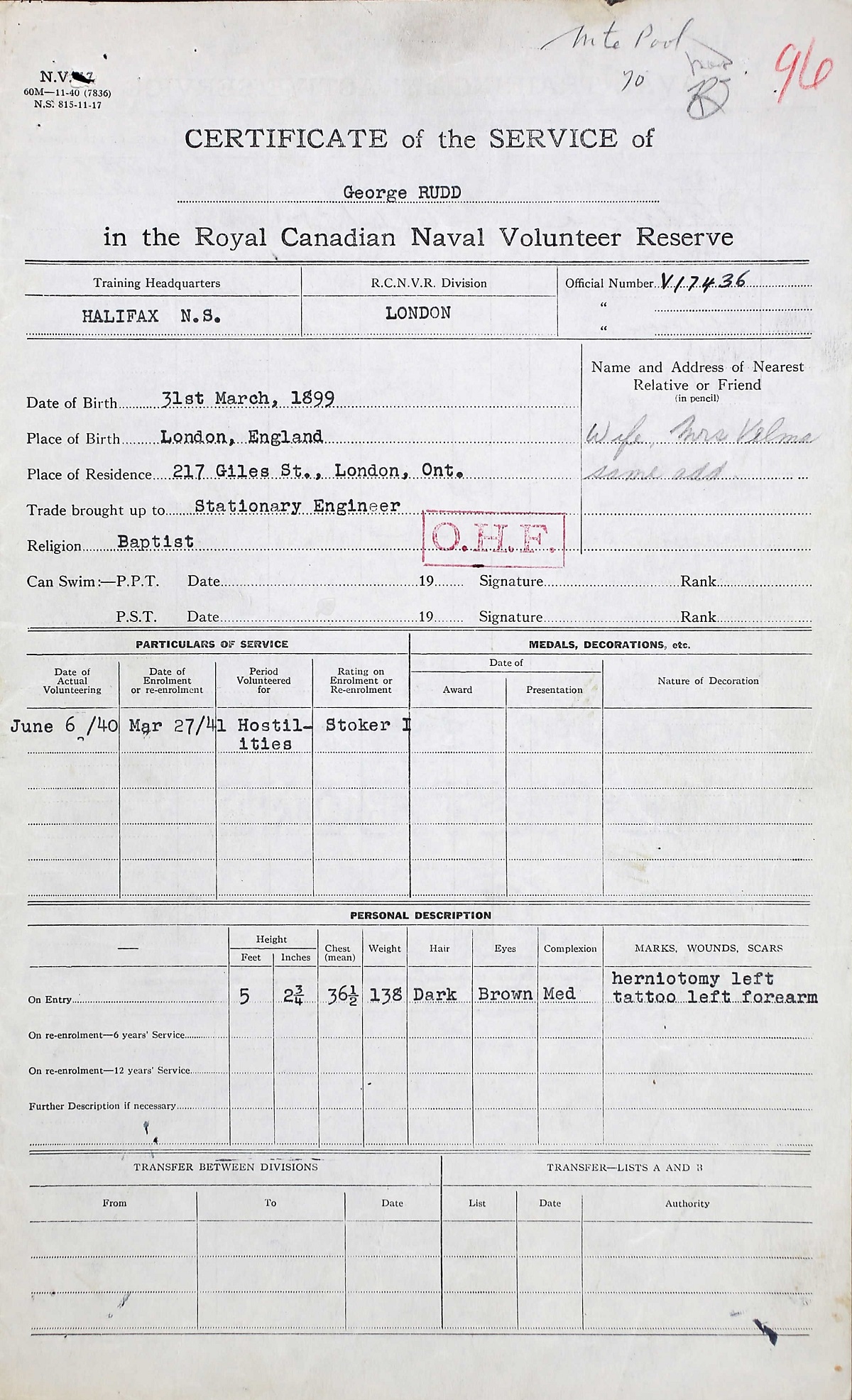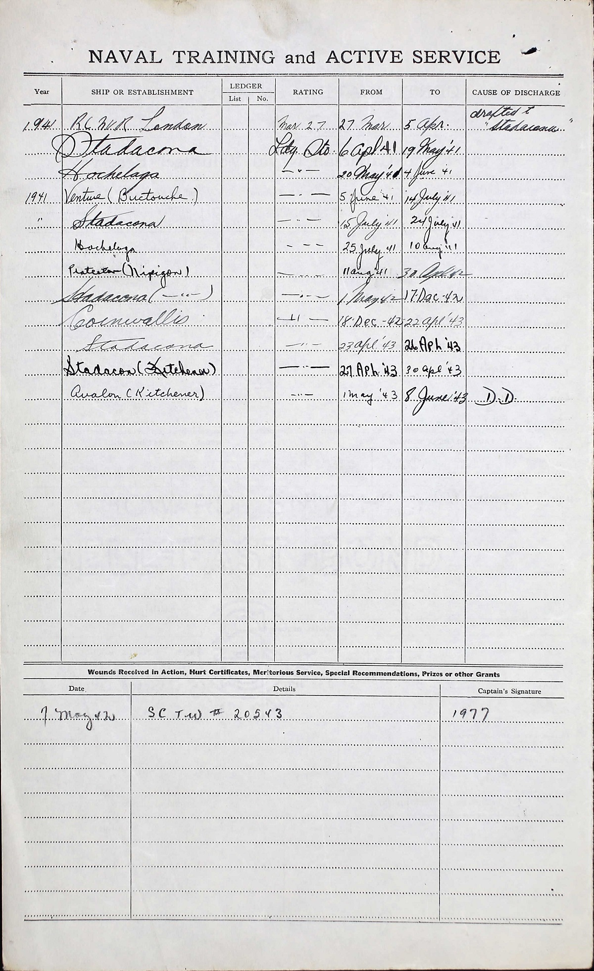 Ships served in: RCNVR DIVISION LONDON - Enlisted 27 Nov 1941 HMCS BUCTOUCHE - Served in BUCTOUCHE 05 Jun 1941 - 14 Jul 1941 as a L/Sto, RCNVR HMCS NIPIGON - Served in NIPIGON 11 Aug 1941 - 17 Dec 1942 as a L/Sto, RCNVR HMCS KITCHENER - Drafted to KITCHENER 27 Apr 1943 as a L/Sto, RCNVR