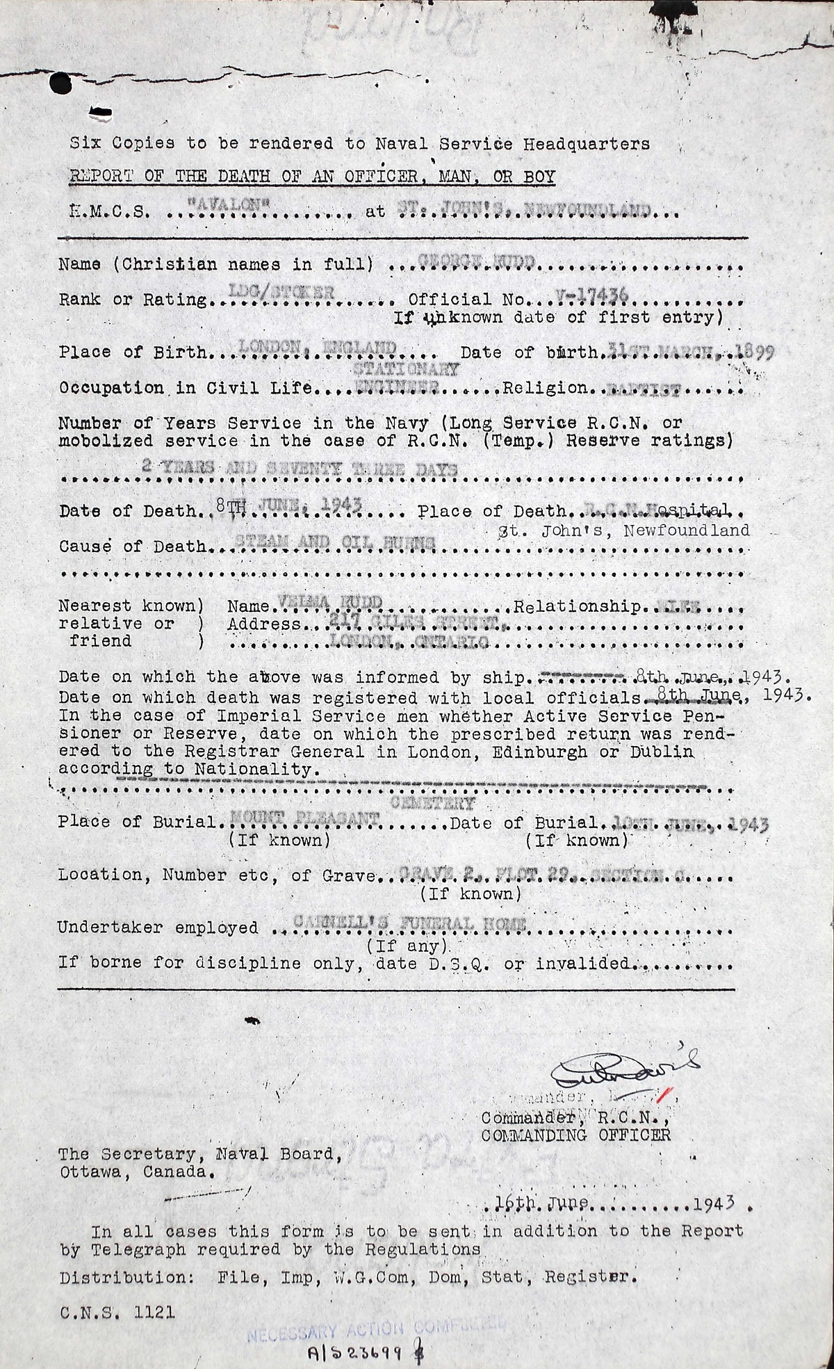 George died on 08 Jun 1943 at the RCN Hospital, St. John's, Newfoundland, from major burns suffered in a fire aboard HMCS KITCHENER on 07 Jun 1943. He is buried in the Mount Pleasant Cemetery, St. John's, Newfoundland.